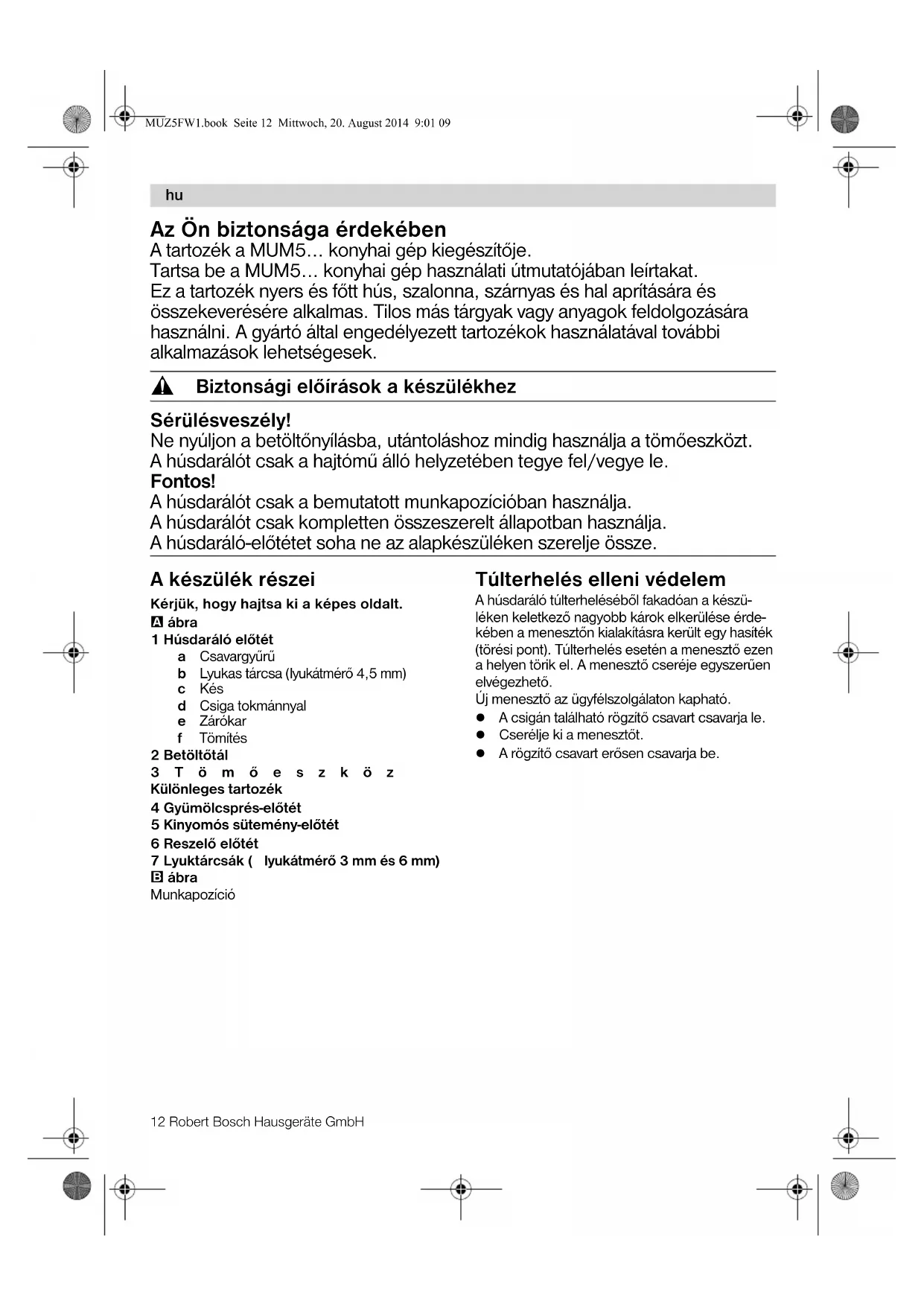 Pridržujemo si pravico do sprememb. MUZ5FW_sl.fm Seite 11 Freitag, 12. September 2014 9:27 0912 Robert Bosch Hausgeräte GmbH Az Ön biztonsága érdekében A tartozék a MUM5... konyhai gép kiegészítõje. Tartsa be a MUM5... konyhai gép használati útmutatójában leírtakat. Ez a tartozék nyers és fõtt hús, szalonna, szárnyas és hal aprítására és összekeverésére alkalmas. Tilos más tárgyak vagy anyagok feldolgozására használni. A gyártó által engedélyezett tartozékok használatával további alkalmazások lehetségesek. , Biztonsági elõírások a készülékhez Sérülésveszély! Ne nyúljon a betöltõnyílásba, utántoláshoz mindig használja a tömõeszközt. A húsdarálót csak a hajtómû álló helyzetében tegye fel/vegye le. Fontos! A húsdarálót csak a bemutatott munkapozícióban használja. A húsdarálót csak kompletten összeszerelt állapotban használja. A húsdaráló-elõtétet soha ne az alapkészüléken szerelje össze. A készülék részei Kérjük, hogy hajtsa ki a képes oldalt. ábra 1 Húsdaráló elõtét