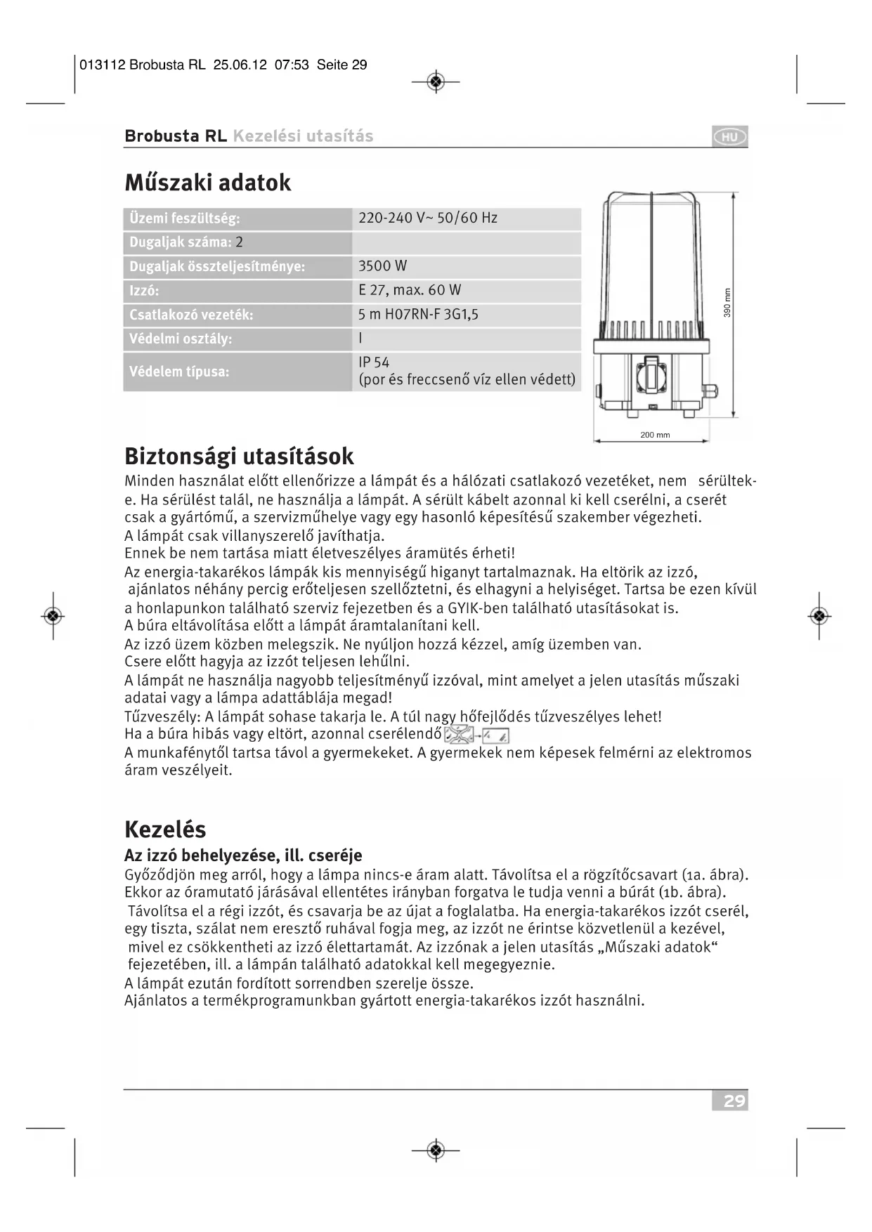 Izzó: E , max . W Csatlakozó vezeték: m HRN-F G, Védelmi osztály: