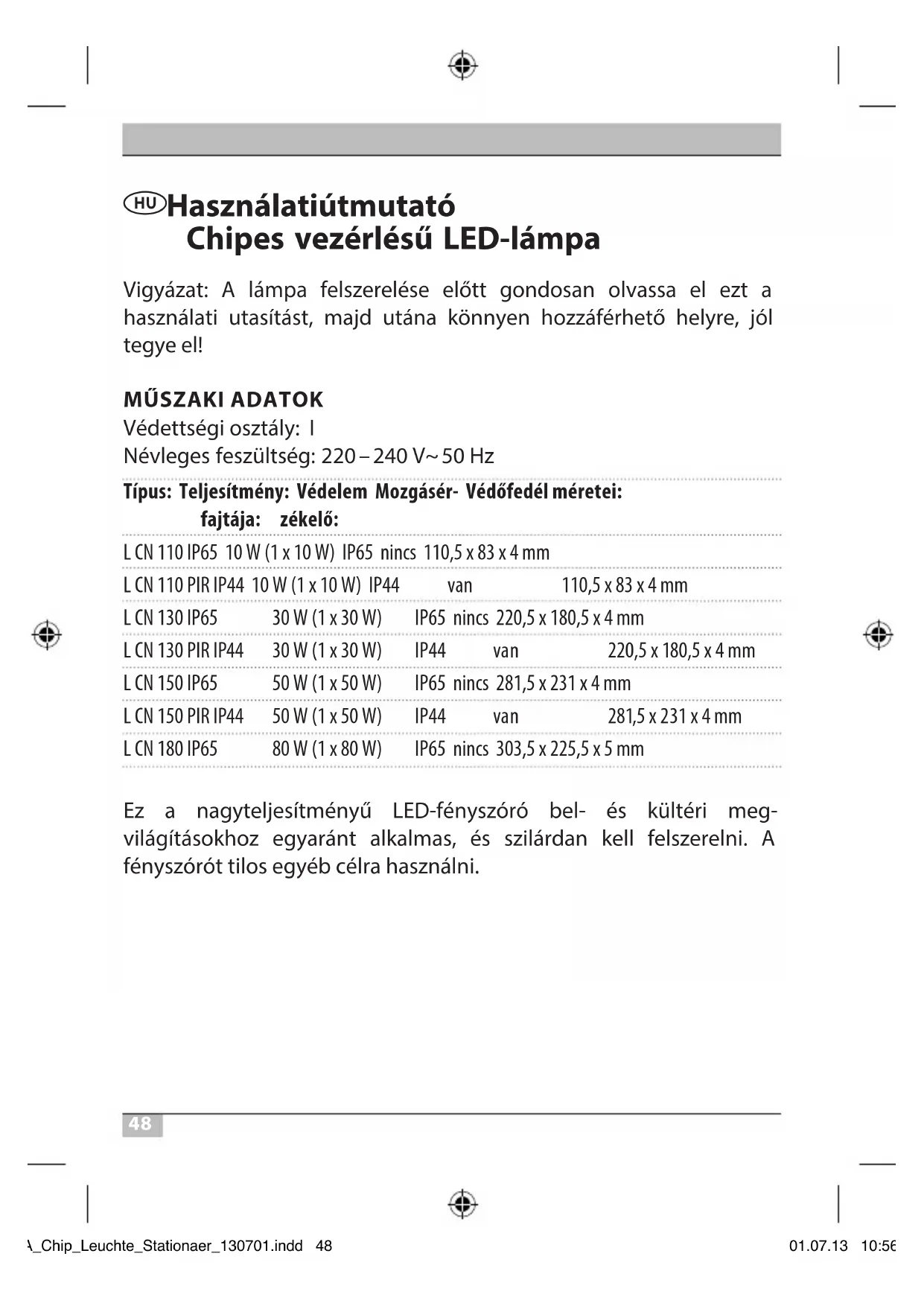 Védettségi osztály: I Névleges feszültség: 220 – 240V~ 50Hz Típus: Teljesítmény: Védelem Mozgásér- Védőfedél méretei: fajtája: zékelő: L CN 110 IP65 10W (1 x 10W) IP65 nincs 110,5 x 83 x 4mm L CN 110 PIR IP44 10W (1 x 10W) IP44 van 110,5 x 83 x 4mm L CN 130 IP65 30W (1 x 30W) IP65 nincs 220,5 x 180,5 x 4mm L CN 130 PIR IP44 30W (1 x 30W) IP44 van 220,5 x 180,5 x 4mm L CN 150 IP65 50W (1 x 50W) IP65 nincs 281,5 x 231 x 4mm L CN 150 PIR IP44 50W (1 x 50W) IP44 van 281,5 x 231 x 4mm L CN 180 IP65 80W (1 x 80W) IP65 nincs 303,5 x 225,5 x 5mm Ez a nagyteljesítményű LED-fényszóró bel- és kültéri meg- világításokhoz egyaránt alkalmas, és szilárdan kell felszerelni. A fényszórót tilos egyéb célra használni. BA_Chip_Leuchte_Stationaer_130701.indd 48 01.07.13 10:5649