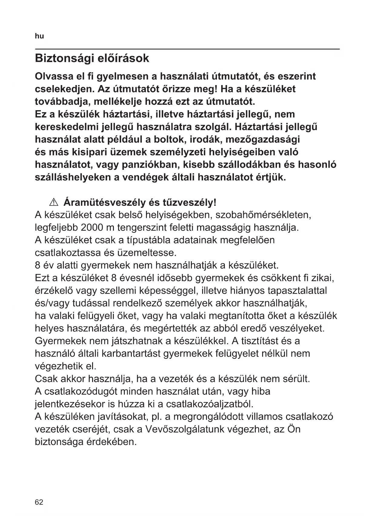 Biztonsági előírások Olvassa el gyelmesen a használati útmutatót, és eszerint cselekedjen. Az útmutatót őrizze meg! Ha a készüléket továbbadja, mellékelje hozzá ezt az útmutatót. Ez a készülék háztartási, illetve háztartási jellegű, nem kereskedelmi jellegű használatra szolgál. Háztartási jellegű használat alatt például a boltok, irodák, mezőgazdasági és más kisipari üzemek személyzeti helyiségeiben való használatot, vagy panziókban, kisebb szállodákban és hasonló szálláshelyeken a vendégek általi használatot értjük. A Áramütésveszély és tűzveszély! A készüléket csak belső helyiségekben, szobahőmérsékleten, legfeljebb 2000 m tengerszint feletti magasságig használja. A készüléket csak a típustábla adatainak megfelelően csatlakoztassa és üzemeltesse. 8 év alatti gyermekek nem használhatják a készüléket. Ezt a készüléket 8 évesnél idősebb gyermekek és csökkent zikai, érzékelő vagy szellemi képességgel, illetve hiányos tapasztalattal és/vagy tudással rendelkező személyek akkor használhatják, ha valaki felügyeli őket, vagy ha valaki megtanította őket a készülék helyes használatára, és megértették az abból eredő veszélyeket. Gyermekek nem játszhatnak a készülékkel. A tisztítást és a használó általi karbantartást gyermekek felügyelet nélkül nem végezhetik el. Csak akkor használja, ha a vezeték és a készülék nem sérült. A csatlakozódugót minden használat után, vagy hiba jelentkezésekor is húzza ki a csatlakozóaljzatból. A készüléken javításokat, pl. a megrongálódott villamos csatlakozó vezeték cseréjét, csak a Vevőszolgálatunk végezhet, az Ön biztonsága érdekében.63