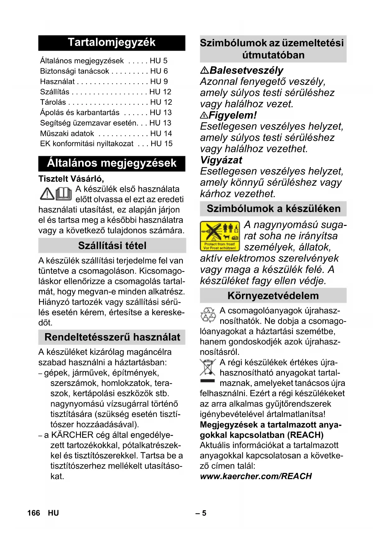 EN 61000–3–3: 2008 EN 62233: 2008 Примененный порядок оценки соответствия 2000/14/ЕС: Приложение V Уровень мощности звука dB(A) Измерено:87 Гарантировано:90 Winnenden, 2013/07/01 CEO Head of Approbation 165RU– 5 Tisztelt Vásárló, A készülék első használata előtt olvassa el ezt az eredeti használati utasítást, ez alapján járjon el és tartsa meg a későbbi használatra vagy a következő tulajdonos számára. A készülék szállítási terjedelme fel van tüntetve a csomagoláson. Kicsomago- láskor ellenőrizze a csomagolás tartal- mát, hogy megvan-e minden alkatrész. Hiányzó tartozék vagy szállítási sérü- lés esetén kérem, értesítse a kereske- dőt. A készüléket kizárólag magáncélra szabad használni a háztartásban: – gépek, járművek, építmények, szerszámok, homlokzatok, tera- szok, kertápolási eszközök stb. nagynyomású vízsugárral történő tisztítására (szükség esetén tisztí- tószer hozzáadásával). – a KÄRCHER cég által engedélye- zett tartozékokkal, pótalkatrészek- kel és tisztítószerekkel. Tartsa be a tisztítószerhez mellékelt utasításo- kat. Balesetveszély Azonnal fenyegető veszély, amely súlyos testi sérüléshez vagy halálhoz vezet. 몇 Figyelem! Esetlegesen veszélyes helyzet, amely súlyos testi sérüléshez vagy halálhoz vezethet. Vigyázat Esetlegesen veszélyes helyzet, amely könnyű sérüléshez vagy kárhoz vezethet. A nagynyomású suga- rat soha ne irányítsa személyek, állatok, aktív elektromos szerelvények vagy maga a készülék felé. A készüléket fagy ellen védje. A csomagolóanyagok újrahasz- nosíthatók. Ne dobja a csomago- lóanyagokat a háztartási szemétbe, hanem gondoskodjék azok újrahasz- nosításról. A régi készülékek értékes újra- hasznosítható anyagokat tartal- maznak, amelyeket tanácsos újra felhasználni. Ezért a régi készülékeket az arra alkalmas gyűjtőrendszerek igénybevételével ártalmatlanítsa! Megjegyzések a tartalmazott anya- gokkal kapcsolatban (REACH) Aktuális információkat a tartalmazott anyagokkal kapcsolatosan a követke- ző címen talál: www.kaercher.com/REACH Tartalomjegyzék Általános megjegyzések . . . . . HU 5 Biztonsági tanácsok . . . . . . . . . HU 6 Használat . . . . . . . . . . . . . . . . . HU 9 Szállítás . . . . . . . . . . . . . . . . . . HU 12 Tárolás . . . . . . . . . . . . . . . . . . . HU 12 Ápolás és karbantartás . . . . . . HU 13 Segítség üzemzavar esetén. . . HU 13 Műszaki adatok . . . . . . . . . . . . HU 14 EK konformitási nyiltakozat . . . HU 15 Általános megjegyzések Szállítási tétel Rendeltetésszerű használat Szimbólumok az üzemeltetési útmutatóban Szimbólumok a készüléken Környezetvédelem 166 HU– 6 Minden országban az illetékes forgal- mazónk által kiadott garancia feltételek érvényesek. Az esetleges üzemzava- rokat az Ön készülékén a garancia le- jártáig költségmentesen elhárítjuk, amennyiben anyag- vagy gyártási hiba az oka. Garanciális esetben kérjük, for- duljon a vásárlást igazoló bizonylattal kereskedőjéhez vagy a legközelebbi hivatalos szakszervizhez. (A címet lásd a hátoldalon) Balesetveszély Ne fogja meg nedves kézzel a hálózati csatlakozót és du- galjat. A készüléket ne helyezze üzembe, ha a hálózati csatla- kozóvezeték vagy a készülék fontos alkatrészei, pl. magas- nyomású tömlő, kézi szóró- pisztoly vagy biztonsági ele- mek meg vannak sérülve. Minden üzem előtt ellenőriz- ze, hogy nem sérült-e a háló- zati dugós csatlakozóveze- ték. A sérült hálózati csatla- kozóvezetéket azonnal cse- réltesse ki felhatalmazott szervizzel/villamos szakem- berrel. Ellenőrize a nagynyomású tömlő épségét minden hasz- nálat előtt. A sérült nagynyo- mású tömlőt azonnal ki kell cserélni. Tilos a tűzveszélyes helyisé- gekben történő üzemeltetés. A készülék veszélyes terüle- ten (pl.: benzinkúton) történő alkalmazása esetén figye- lembe kell venni a megfelelő biztonsági előírásokat. A nagynyomású vízsugár ve- szélyes lehet szakszerűtlen használat esetén. A vízsuga- rat soha ne irányítsa sze- mélyre, állatra, működésben lévő elektromos alkatrészre vagy a készülékre magára. A magasnyomású vízsugarat ne irányítsa se önmagára se másokra, a ruházat vagy a lábbeli tisztítására. Nem szabad olyan tárgyat le- locsolni, amely egészségre káros anyagot (pl. azbesztet) tartalmaz. Az autógumit/szelepet a nagynyomású sugár károsít- hatja és roncsolhatja. A káro- sodás első jele az autógumi elszíneződése. A sérült autó- gumik/kerékszelepek életve- szélyesek. A tisztítás során legalább 30 cm távolságot kell betartani! Robbanásveszély! Gyúlékony folyadékot nem szabad permetezni vele. Soha ne szívjon fel oldószer tartalmú folyadékot vagy hígí- tatlan savakat és oldószere- ket! Ide tartozik pl. a benzin, a hígító vagy a fűtőolaj. A per- metköd nagyon gyúlékony, robbanékony és mérgező. Garancia Biztonsági tanácsok 167HU– 7 Ne használjon acetont, hígí- tatlan savakat és oldószere- ket, mivel ezek a készülékben lévő anyagokat megtámadják. 몇 Figyelem! A hosszabbító vezeték háló- zati csatlakozójának és csat- lakozójának vízállónak kell lennie és nem szabad vízben feküdnie. A csatlakozót to- vább nem szabad a padlóra fektetni. Ajánlott a kábeldo- bok használata, amelyek biz- tosítják, hogy a dugaljak leg- alább 60 mm-rel a padló fölött legyenek. Az alkalmatlan elektromos hosszabbító vezetékek ve- szélyt okozhatnak. A szabad- ban kizárólag az adott célra engedélyezett és megfelelő jelöléssel ellátott, megfelelő keresztmetszetű elektromos hosszabbító vezetékeket használjon: 1 - 10 m: 1,5