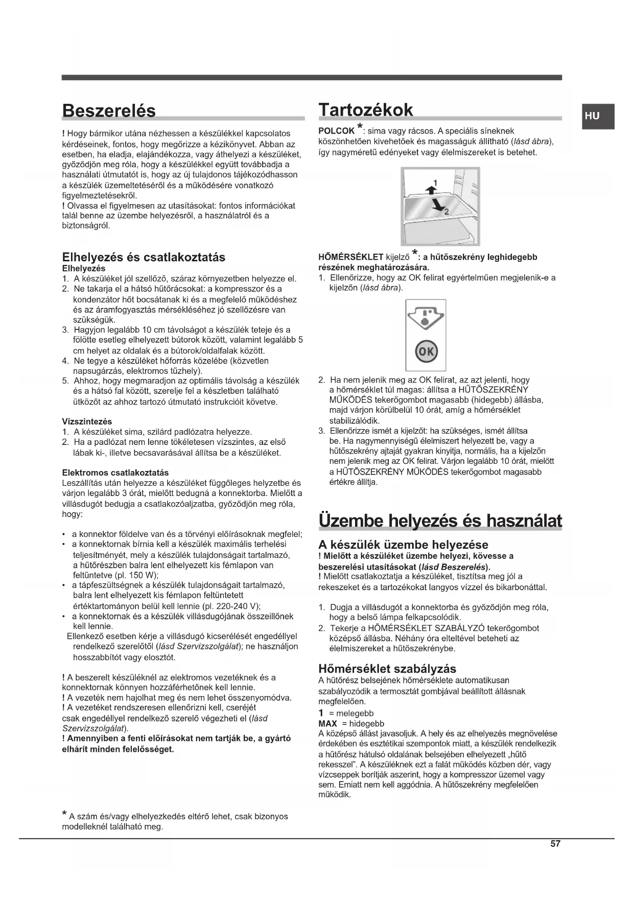 Beszerelés ! Hogy bármikor utána nézhessen a készülékkel kapcsolatos kérdéseinek, fontos, hogy megőrizze a kézikönyvet. Abban az esetben, ha eladja, elajándékozza, vagy áthelyezi a készüléket, győződjön meg róla, hogy a készülékkel együtt továbbadja a használati útmutatót is, hogy az új tulajdonos tájékozódhasson a készülék üzemeltetéséről és a működésére vonatkozó gyelmeztetésekről.! Olvassa el gyelmesen az utasításokat: fontos információkat talál benne az üzembe helyezésről, a használatról és a biztonságról. Elhelyezés és csatlakoztatás Elhelyezés1. A készüléket jól szellőző, száraz környezetben helyezze el.2. Ne takarja el a hátsó hűtőrácsokat: a kompresszor és a kondenzátor hőt bocsátanak ki és a megfelelő működéshez és az áramfogyasztás mérsékléséhez jó szellőzésre van szükségük.3. Hagyjon legalább 10 cm távolságot a készülék teteje és a fölötte esetleg elhelyezett bútorok között, valamint legalább 5 cm helyet az oldalak és a bútorok/oldalfalak között.4. Ne tegye a készüléket hőforrás közelébe (közvetlen napsugárzás, elektromos tűzhely).5. Ahhoz, hogy megmaradjon az optimális távolság a készülék és a hátsó fal között, szerelje fel a készletben található ütközőt az ahhoz tartozó útmutató instrukcióit követve.Vízszintezés1. A készüléket sima, szilárd padlózatra helyezze.2. Ha a padlózat nem lenne tökéletesen vízszintes, az első lábak ki-, illetve becsavarásával állítsa be a készüléket.Elektromos csatlakoztatásLeszállítás után helyezze a készüléket függőleges helyzetbe és várjon legalább 3 órát, mielőtt bedugná a konnektorba. Mielőtt a villásdugót bedugja a csatlakozóaljzatba, győződjön meg róla, hogy:• a konnektor földelve van és a törvényi előírásoknak megfelel;• a konnektornak bírnia kell a készülék maximális terhelési teljesítményét, mely a készülék tulajdonságait tartalmazó, a hűtőrészben balra lent elhelyezett kis fémlapon van feltüntetve (pl. 150 W);• a tápfeszültségnek a készülék tulajdonságait tartalmazó, balra lent elhelyezett kis fémlapon feltüntetett értéktartományon belül kell lennie (pl. 220-240 V);• a konnektornak és a készülék villásdugójának összeillőnek kell lennie. Ellenkező esetben kérje a villásdugó kicserélését engedéllyel rendelkező szerelőtől (lásd Szervizszolgálat); ne használjon hosszabbítót vagy elosztót.! A beszerelt készüléknél az elektromos vezetéknek és a konnektornak könnyen hozzáférhetőnek kell lennie.! A vezeték nem hajolhat meg és nem lehet összenyomódva.! A vezetéket rendszeresen ellenőrizni kell, cseréjét csak engedéllyel rendelkező szerelő végezheti el (lásd Szervizszolgálat).! Amennyiben a fenti előírásokat nem tartják be, a gyártó elhárít minden felelősséget. Tartozékok POLCOK *: sima vagy rácsos. A speciális síneknek köszönhetően kivehetőek és magasságuk állítható (lásd ábra), így nagyméretű edényeket vagy élelmiszereket is betehet.HŐMÉRSÉKLET kijelző *: a hűtőszekrény leghidegebb részének meghatározására.1. Ellenőrizze, hogy az OK felirat egyértelműen megjelenik-e a kijelzőn (lásd ábra).2. Ha nem jelenik meg az OK felirat, az azt jelenti, hogy a hőmérséklet túl magas: állítsa a HŰTŐSZEKRÉNY MŰKÖDÉS tekerőgombot magasabb (hidegebb) állásba, majd várjon körülbelül 10 órát, amíg a hőmérséklet stabilizálódik.3. Ellenőrizze ismét a kijelzőt: ha szükséges, ismét állítsa be. Ha nagymennyiségű élelmiszert helyezett be, vagy a hűtőszekrény ajtaját gyakran kinyitja, normális, ha a kijelzőn nem jelenik meg az OK felirat. Várjon legalább 10 órát, mielőtt a HŰTŐSZEKRÉNY MŰKÖDÉS tekerőgombot magasabb értékre állítja. Üzembe helyezés és használat A készülék üzembe helyezése ! Mielőtt a készüléket üzembe helyezi, kövesse a beszerelési utasításokat (lásd Beszerelés).! Mielőtt csatlakoztatja a készüléket, tisztítsa meg jól a rekeszeket és a tartozékokat langyos vízzel és bikarbonáttal.1. Dugja a villásdugót a konnektorba és győződjön meg róla, hogy a belső lámpa felkapcsolódik.2. Tekerje a HŐMÉRSÉKLET SZABÁLYZÓ tekerőgombot középső állásba. Néhány óra elteltével beteheti az élelmiszereket a hűtőszekrénybe. Hőmérséklet szabályzás A hűtőrész belsejének hőmérséklete automatikusan szabályozódik a termosztát gombjával beállított állásnak megfelelően. 1 = melegebb MAX = hidegebbA középső állást javasoljuk. A hely és az elhelyezés megnövelése érdekében és esztétikai szempontok miatt, a készülék rendelkezik a hűtőrész hátulsó oldalának belsejében elhelyezett „hűtő rekesszel”. A készüléknek ezt a falát működés közben dér, vagy vízcseppek borítják aszerint, hogy a kompresszor üzemel vagy sem. Emiatt nem kell aggódnia. A hűtőszekrény megfelelően működik.