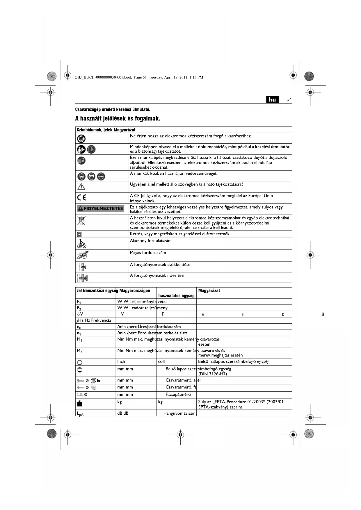 Nm Nm max. meghúzási nyomaték kemény csavarozás és merev meghajtás esetén inch coll Belső hatlapos szerszámbefogó egység mm mm Belső lapos szerszámbefogó egység (DIN 3126-H7) mm mm Csavarátmérő, acél mm mm Csavarátmérő, fa mm mm Facsapátmérő kg kg Súly az „EPTA-Procedure 01/2003” (2003/01 EPTA-szabvány) szerint