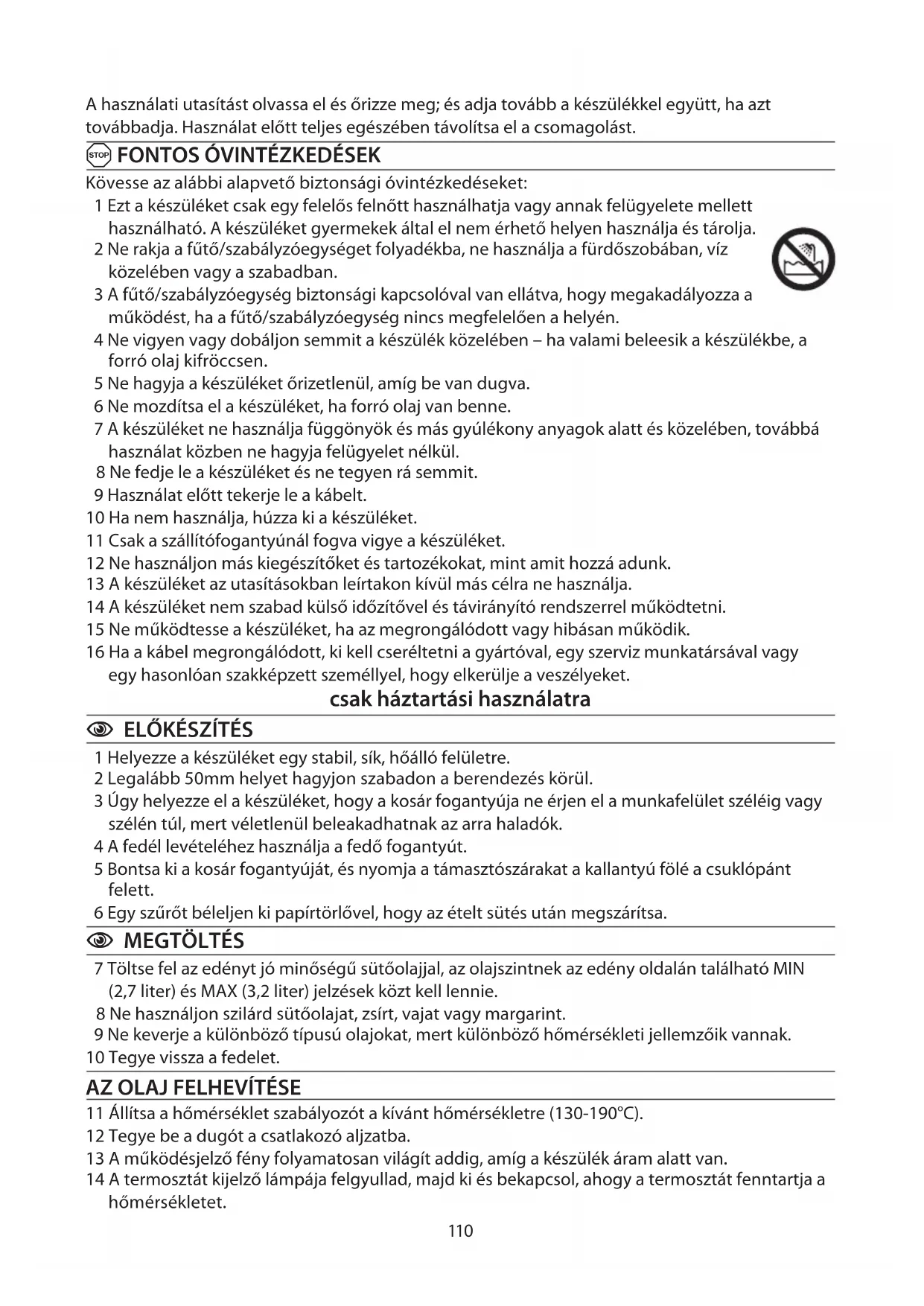 Kövesse az alábbi alapvető biztonsági óvintézkedéseket: 1 Ezt a készüléket csak egy felelős felnőtt használhatja vagy annak felügyelete mellett használható. A készüléket gyermekek által el nem érhető helyen használja és tárolja. 2 Ne rakja a fűtő/szabályzóegységet folyadékba, ne használja a fürdőszobában, víz közelében vagy a szabadban. 3 A fűtő/szabályzóegység biztonsági kapcsolóval van ellátva, hogy megakadályozza a működést, ha a fűtő/szabályzóegység nincs megfelelően a helyén. 4 Ne vigyen vagy dobáljon semmit a készülék közelében – ha valami beleesik a készülékbe, a forró olaj kifröccsen. 5 Ne hagyja a készüléket őrizetlenül, amíg be van dugva. 6 Ne mozdítsa el a készüléket, ha forró olaj van benne. 7 A készüléket ne használja függönyök és más gyúlékony anyagok alatt és közelében, továbbá használat közben ne hagyja felügyelet nélkül. 8 Ne fedje le a készüléket és ne tegyen rá semmit. 9 Használat előtt tekerje le a kábelt. 10 Ha nem használja, húzza ki a készüléket. 11 Csak a szállítófogantyúnál fogva vigye a készüléket. 12 Ne használjon más kiegészítőket és tartozékokat, mint amit hozzá adunk. 13 A készüléket az utasításokban leírtakon kívül más célra ne használja. 14 A készüléket nem szabad külső időzítővel és távirányító rendszerrel működtetni. 15 Ne működtesse a készüléket, ha az megrongálódott vagy hibásan működik. 16 Ha a kábel megrongálódott, ki kell cseréltetni a gyártóval, egy szerviz munkatársával vagy egy hasonlóan szakképzett személlyel, hogy elkerülje a veszélyeket. csak háztartási használatra