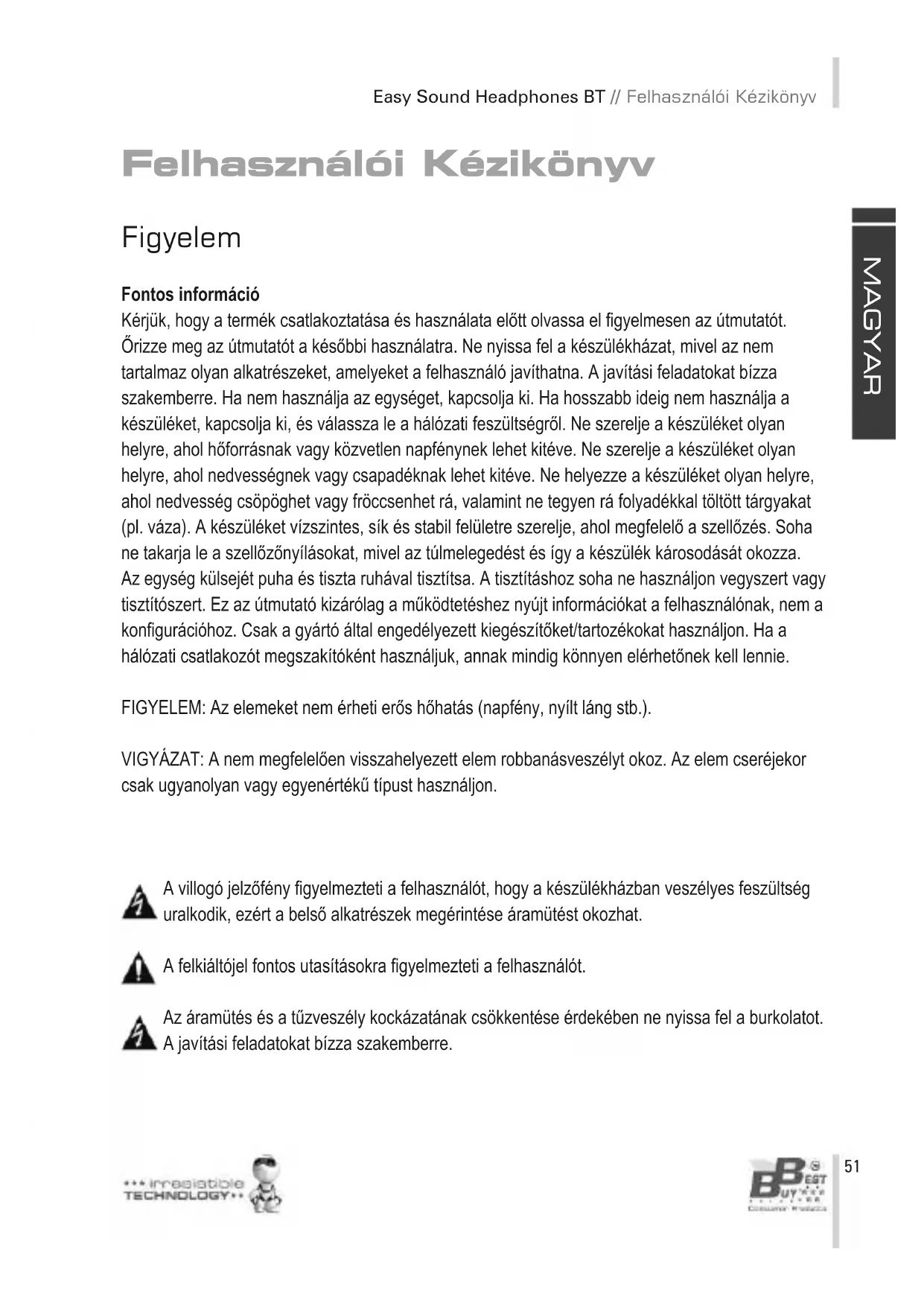 Felhasználói Kézikönyv Figyelem Fontos információ Kérjük, hogy a termék csatlakoztatása és használata előtt olvassa el figyelmesen az útmutatót. Őrizze meg az útmutatót a későbbi használatra. Ne nyissa fel a készülékházat, mivel az nem tartalmaz olyan alkatrészeket, amelyeket a felhasználó javíthatna. A javítási feladatokat bízza szakemberre. Ha nem használja az egységet, kapcsolja ki. Ha hosszabb ideig nem használja a készüléket, kapcsolja ki, és válassza le a hálózati feszültségről. Ne szerelje a készüléket olyan helyre, ahol hőforrásnak vagy közvetlen napfénynek lehet kitéve. Ne szerelje a készüléket olyan helyre, ahol nedvességnek vagy csapadéknak lehet kitéve. Ne helyezze a készüléket olyan helyre, ahol nedvesség csöpöghet vagy fröccsenhet rá, valamint ne tegyen rá folyadékkal töltött tárgyakat (pl. váza). A készüléket vízszintes, sík és stabil felületre szerelje, ahol megfelelő a szellőzés. Soha ne takarja le a szellőzőnyílásokat, mivel az túlmelegedést és így a készülék károsodását okozza. Az egység külsejét puha és tiszta ruhával tisztítsa. A tisztításhoz soha ne használjon vegyszert vagy tisztítószert. Ez az útmutató kizárólag a működtetéshez nyújt információkat a felhasználónak, nem a konfigurációhoz. Csak a gyártó által engedélyezett kiegészítőket/tartozékokat használjon. Ha a hálózati csatlakozót megszakítóként használjuk, annak mindig könnyen elérhetőnek kell lennie. FIGYELEM: Az elemeket nem érheti erős hőhatás (napfény, nyílt láng stb.). VIGYÁZAT: A nem megfelelően visszahelyezett elem robbanásveszélyt okoz. Az elem cseréjekor csak ugyanolyan vagy egyenértékű típust használjon. A villogó jelzőfény figyelmezteti a felhasználót, hogy a készülékházban veszélyes feszültség uralkodik, ezért a belső alkatrészek megérintése áramütést okozhat. A felkiáltójel fontos utasításokra figyelmezteti a felhasználót. Az áramütés és a tűzveszély kockázatának csökkentése érdekében ne nyissa fel a burkolatot. A javítási feladatokat bízza szakemberre.M A G YA R Felhasználói Kézikönyv // Easy Sound Headphones BT