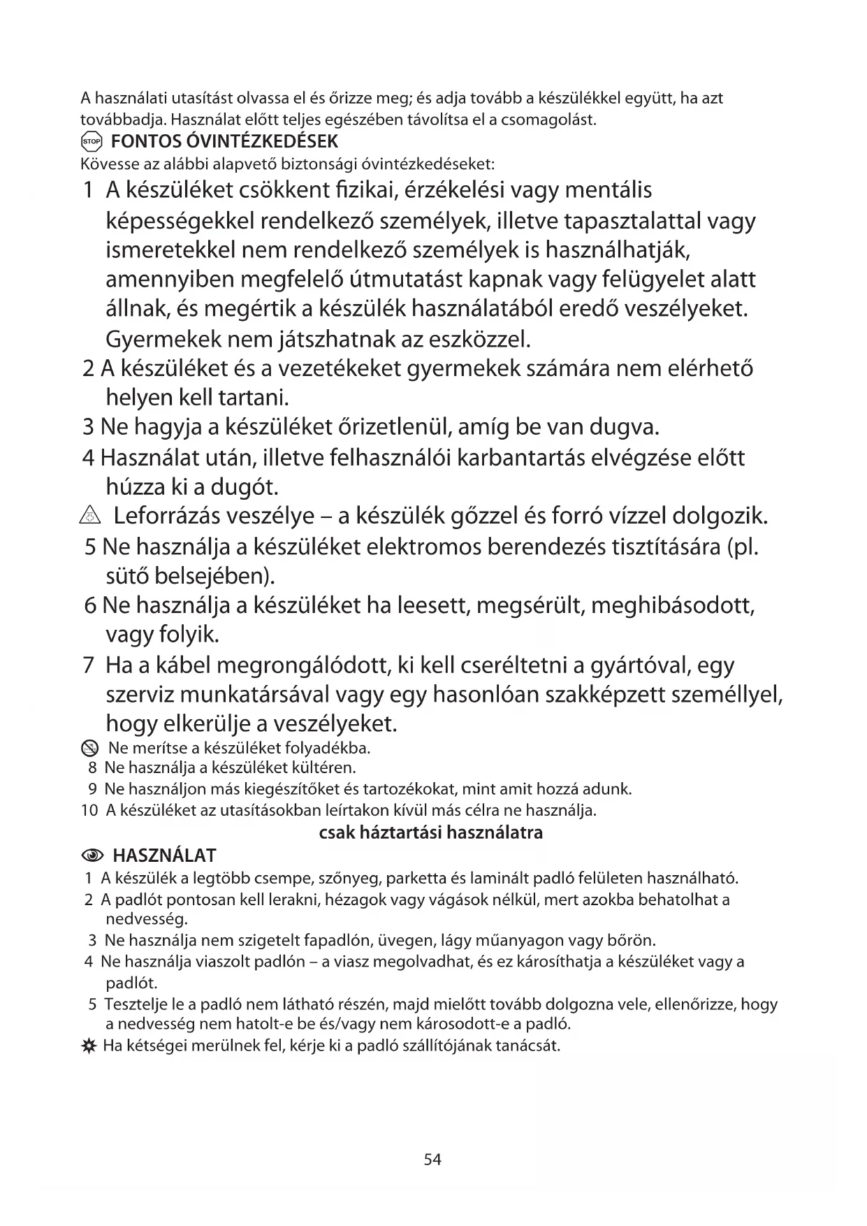 Kövesse az alábbi alapvető biztonsági óvintézkedéseket: 1 A készüléket csökkent fizikai, érzékelési vagy mentális képességekkel rendelkező személyek, illetve tapasztalattal vagy ismeretekkel nem rendelkező személyek is használhatják, amennyiben megfelelő útmutatást kapnak vagy felügyelet alatt állnak, és megértik a készülék használatából eredő veszélyeket. Gyermekek nem játszhatnak az eszközzel. 2 A készüléket és a vezetékeket gyermekek számára nem elérhető helyen kell tartani. 3 Ne hagyja a készüléket őrizetlenül, amíg be van dugva. 4 Használat után, illetve felhasználói karbantartás elvégzése előtt húzza ki a dugót. $ Leforrázás veszélye – a készülék gőzzel és forró vízzel dolgozik. 5 Ne használja a készüléket elektromos berendezés tisztítására (pl. sütő belsejében). 6 Ne használja a készüléket ha leesett, megsérült, meghibásodott, vagy folyik. 7 Ha a kábel megrongálódott, ki kell cseréltetni a gyártóval, egy szerviz munkatársával vagy egy hasonlóan szakképzett személlyel, hogy elkerülje a veszélyeket. H Ne merítse a készüléket folyadékba. 8 Ne használja a készüléket kültéren. 9 Ne használjon más kiegészítőket és tartozékokat, mint amit hozzá adunk. 10 A készüléket az utasításokban leírtakon kívül más célra ne használja. csak háztartási használatra