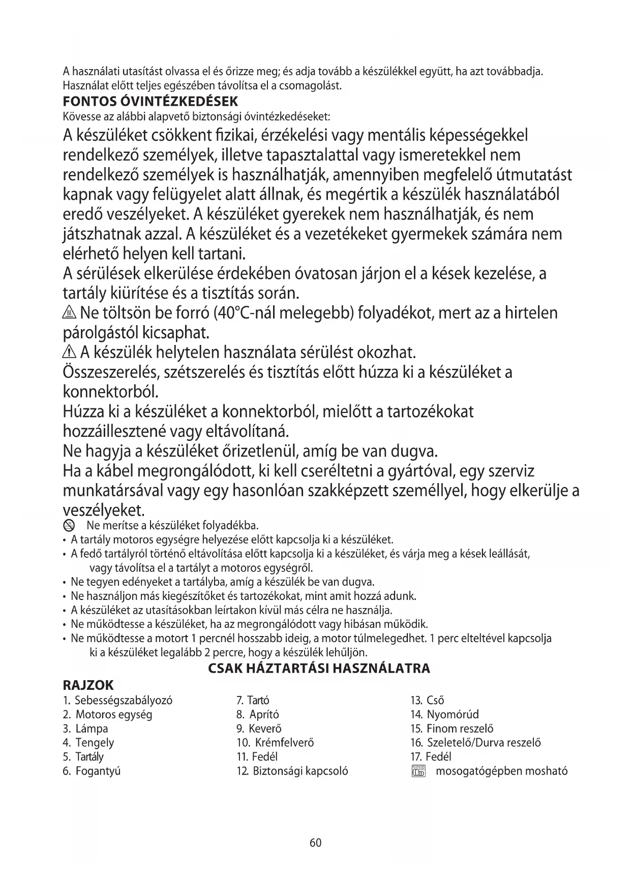 • Amíg a motor jár, ne próbálja meg elmozdítani a fedelet, vagy a tartályt.