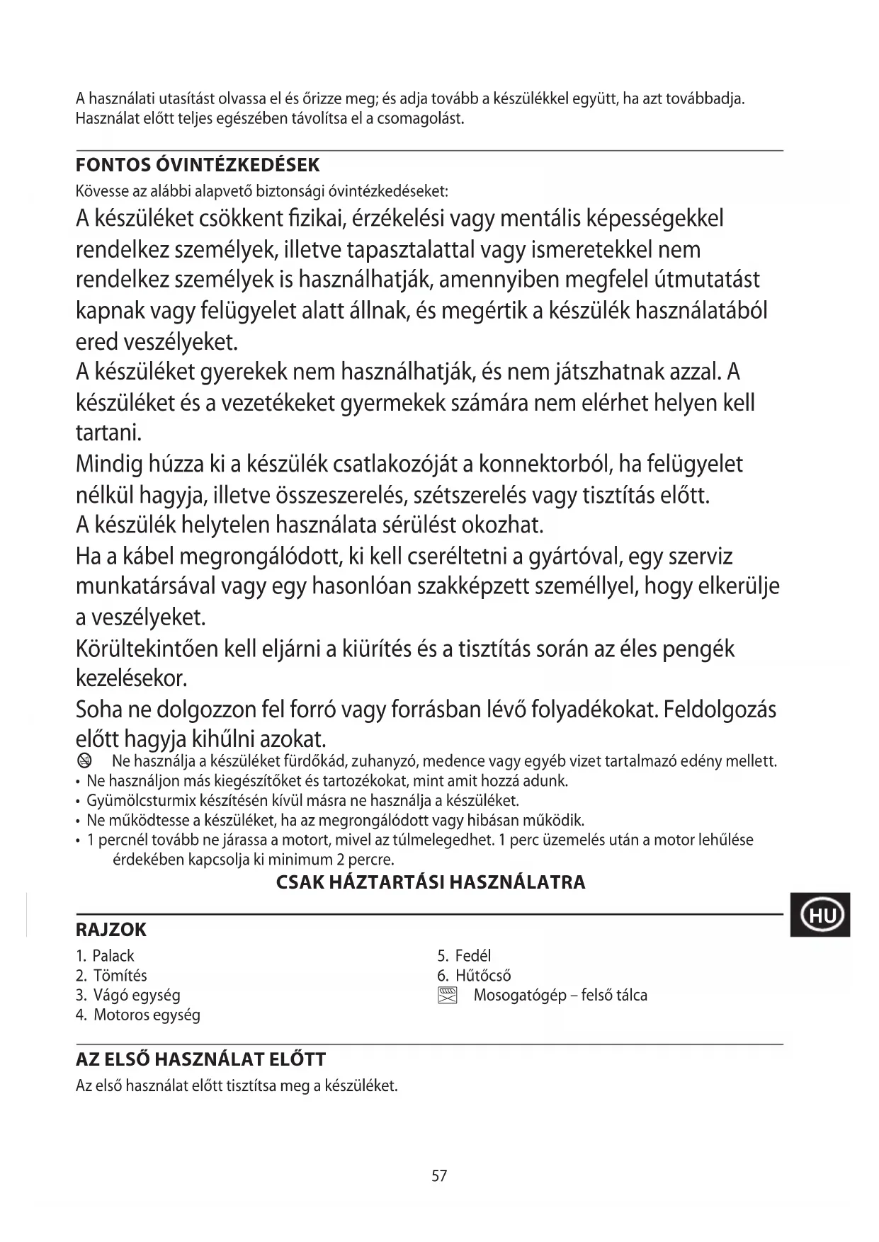 Kövesse az alábbi alapvető biztonsági óvintézkedéseket: A készüléket csökkent fizikai, érzékelési vagy mentális képességekkel rendelkez személyek, illetve tapasztalattal vagy ismeretekkel nem rendelkez személyek is használhatják, amennyiben megfelel útmutatást kapnak vagy felügyelet alatt állnak, és megértik a készülék használatából ered veszélyeket. A készüléket gyerekek nem használhatják, és nem játszhatnak azzal. A készüléket és a vezetékeket gyermekek számára nem elérhet helyen kell tartani. Mindig húzza ki a készülék csatlakozóját a konnektorból, ha felügyelet nélkül hagyja, illetve összeszerelés, szétszerelés vagy tisztítás előtt. A készülék helytelen használata sérülést okozhat. Ha a kábel megrongálódott, ki kell cseréltetni a gyártóval, egy szerviz munkatársával vagy egy hasonlóan szakképzett személlyel, hogy elkerülje a veszélyeket. Körültekintően kell eljárni a kiürítés és a tisztítás során az éles pengék kezelésekor. Soha ne dolgozzon fel forró vagy forrásban lévő folyadékokat. Feldolgozás előtt hagyja kihűlni azokat. b Ne használja a készüléket fürdőkád, zuhanyzó, medence vagy egyéb vizet tartalmazó edény mellett.