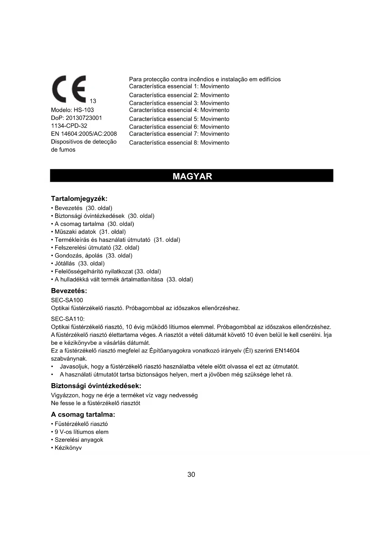 Ez a füstérzékelő riasztó megfelel az Építőanyagokra vonatkozó irányelv (ÉI) szerinti EN14604