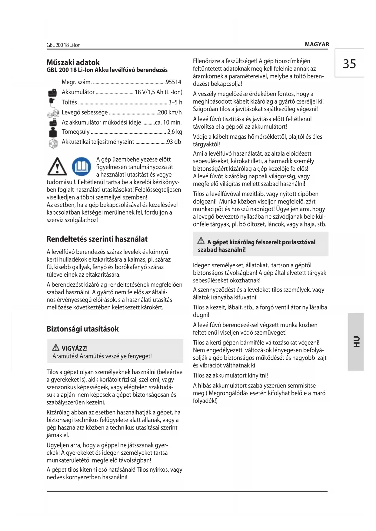 - A gép üzembehelyezése előtt gyelmesen tanulmányozza át a használati utasítást és vegye tudomásul!. Feltétlenül tartsa be a kezelői kézikönyv- ben foglalt használati utasításokat! Felelősségteljesen viselkedjen a többi személlyel szemben! Az esetben, ha a gép bekapcsolásával és kezelésével kapcsolatban kétségei merülnének fel, forduljon a szerviz szolgálathoz! Rendeltetés szerinti használat A levélfúvó berendezés száraz levelek és könnyű kerti hulladékok eltakarítására alkalmas, pl. száraz fű, kisebb gallyak, fenyő és borókafenyő száraz tűleveleinek az eltakarítására. A berendezést kizárólag rendeltetésének megfelelően szabad használni! A gyártó nem felelős az általá- nos érvényességű előírások, s a használati utasítás mellőzése következtében keletkezett károkért. Biztonsági utasítások VIGYÁZZ! Áramütés! Áramütés veszélye fenyeget! Tilos a gépet olyan személyeknek használni (beleértve a gyerekeket is), akik korlátolt zikai, szellemi, vagy szenzorikus képességeik, vagy elégtelen szaktudá- suk alapján nem képesek a gépet biztonságosan és szabályszerűen kezelni. Kizárólag abban az esetben használhatják a gépet, ha biztonsági technikus felügyelete alatt állanak, vagy a gép használata közben a technikus utasításai szerint járnak el. Ügyeljen arra, hogy a géppel ne játsszanak gyer- ekek! A gyerekeket és idegen személyeket tartsa munkaterületétől megfelelő távolságban! A gépet tilos kitenni eső hatásának! Tilos nyirkos, vagy nedves környezetben használni! Ellenőrizze a feszültséget! A gép tipuscímkéjén feltüntetett adatoknak meg kell felelnie annak az áramkörnek a paramétereivel, melybe a töltő beren- dezést bekapcsolja! A veszély megelőzése érdekében fontos, hogy a meghibásodott kábelt kizárólag a gyártó cseréljei ki! Szigorúan tilos a javításokat sajátkezüleg végezni! A levélfúvó tisztítása és javítása előtt feltétlenül távolítsa el a gépből az akkumulátort! Védje a kábelt magas hőmérséklettől, olajtól és éles tárgyaktól! Ami a levélfúvó használatát, az általa előidézett sebesüléseket, károkat illeti, a harmadik személy biztonságáért kizárólag a gép kezelője felelős! A levélfúvót kizárólag nappali világosság, vagy megfelelő világítás mellett szabad használni! Tilos a levélfúvóval mezitláb, vagy nyitott cipőben dolgozni! Munka közben viseljen megfelelő, zárt munkacipőt és hosszú nadrágot! Ügyeljen arra, hogy a levegő bevezető nyílásába ne szívódjanak bele kül- önféle tárgyak, pl. bő öltözet, láncok, vagy a haja, stb. A gépet kizárólag felszerelt porlasztóval szabad használni! Idegen személyeket, állatokat, tartson a géptől biztonságos távolságban! A gép által elvetett tárgyak sebesüléseket okozhatnak! A szennyeződést és a leveleket tilos személyek, vagy állatok irányába kifuvatni! Tilos a kezeit, lábait, stb., a forgó ventillátor nyílásaiba dugni! A levélfúvó berendezéssel végzett munka közben feltétlenül viseljen védő szemüveget! Tilos a kerti gépen bármiféle változásokat végezni! Nem engedélyezett változások lényegesen befolyá- solják a gép biztonságos működését és nagyobb zajt és vibrációt válthatnak ki! Tilos az akkumulátort kinyitni! A hibás akkumulátort szabályszerűen semmisítse meg ( Megrongálódás esetén kifolyhat belőle a maró folyadék!) Műszaki adatok GBL 200 18 Li-Ion Akku levélfúvó berendezés Megr. szám p. 9551