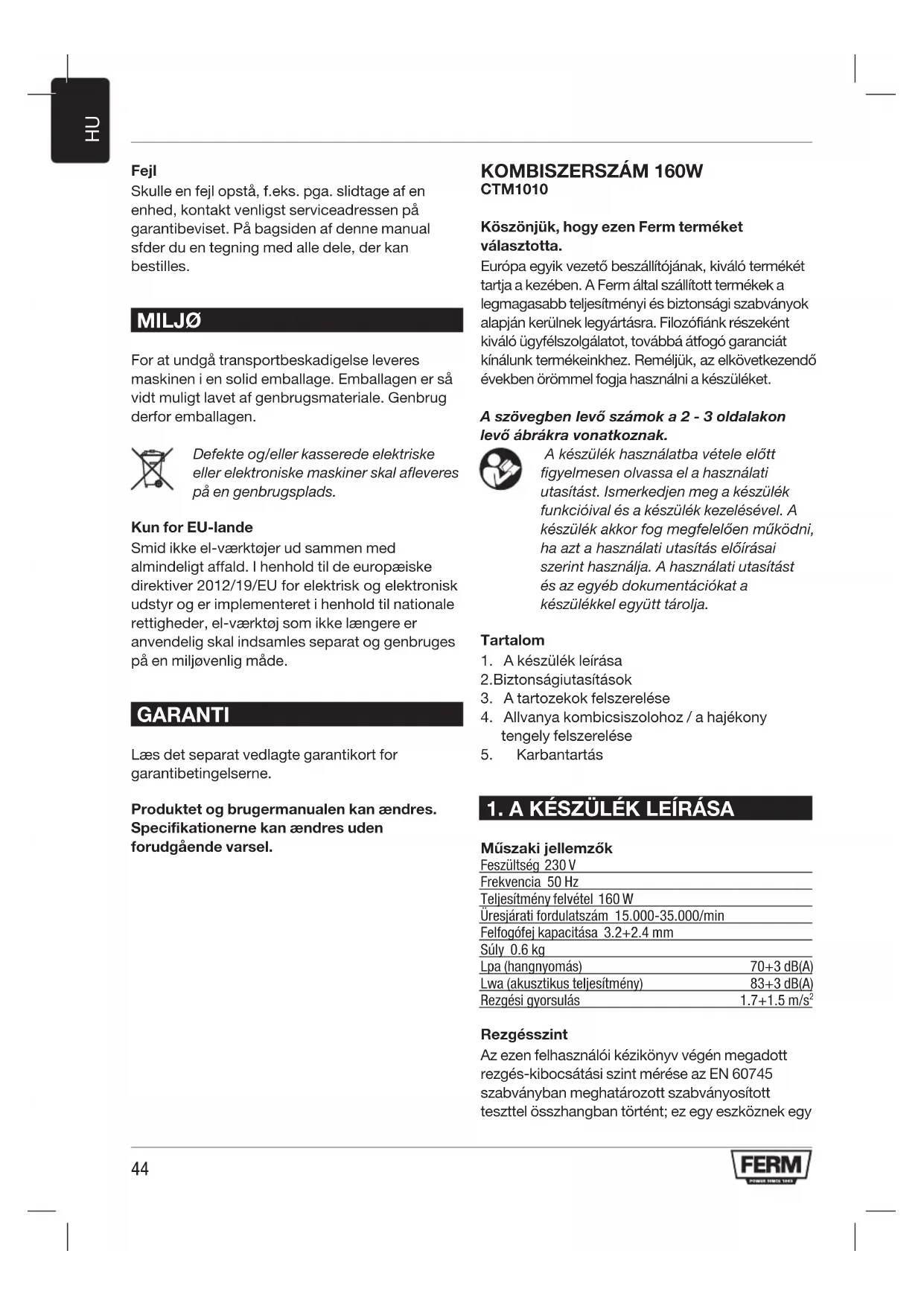 CTM1010 Köszönjük, hogy ezen Ferm terméket választotta. Európaegyikvezetőbeszállítójának,kiválótermékét tartja a kezében. A Ferm által szállított termékek a legmagasabb teljesítményi és biztonsági szabványok alapján kerülnek legyártásra. Filozófiánk részeként kiváló ügyfélszolgálatot, továbbá átfogó garanciát kínálunktermékeinkhez.Reméljük,azelkövetkezendő években örömmel fogja használni a készüléket. A szövegben levő számok a 2 - 3 oldalakon levő ábrákra vonatkoznak. Akészülékhasználatbavételeelőtt figyelmesen olvassa el a használati utasítást. Ismerkedjen meg a készülék funkcióival és a készülék kezelésével. A készülékakkorfogmegfelelőenműködni, haaztahasználatiutasításelőírásai szerint használja. A használati utasítást és az egyéb dokumentációkat a készülékkel együtt tárolja. Tartalom