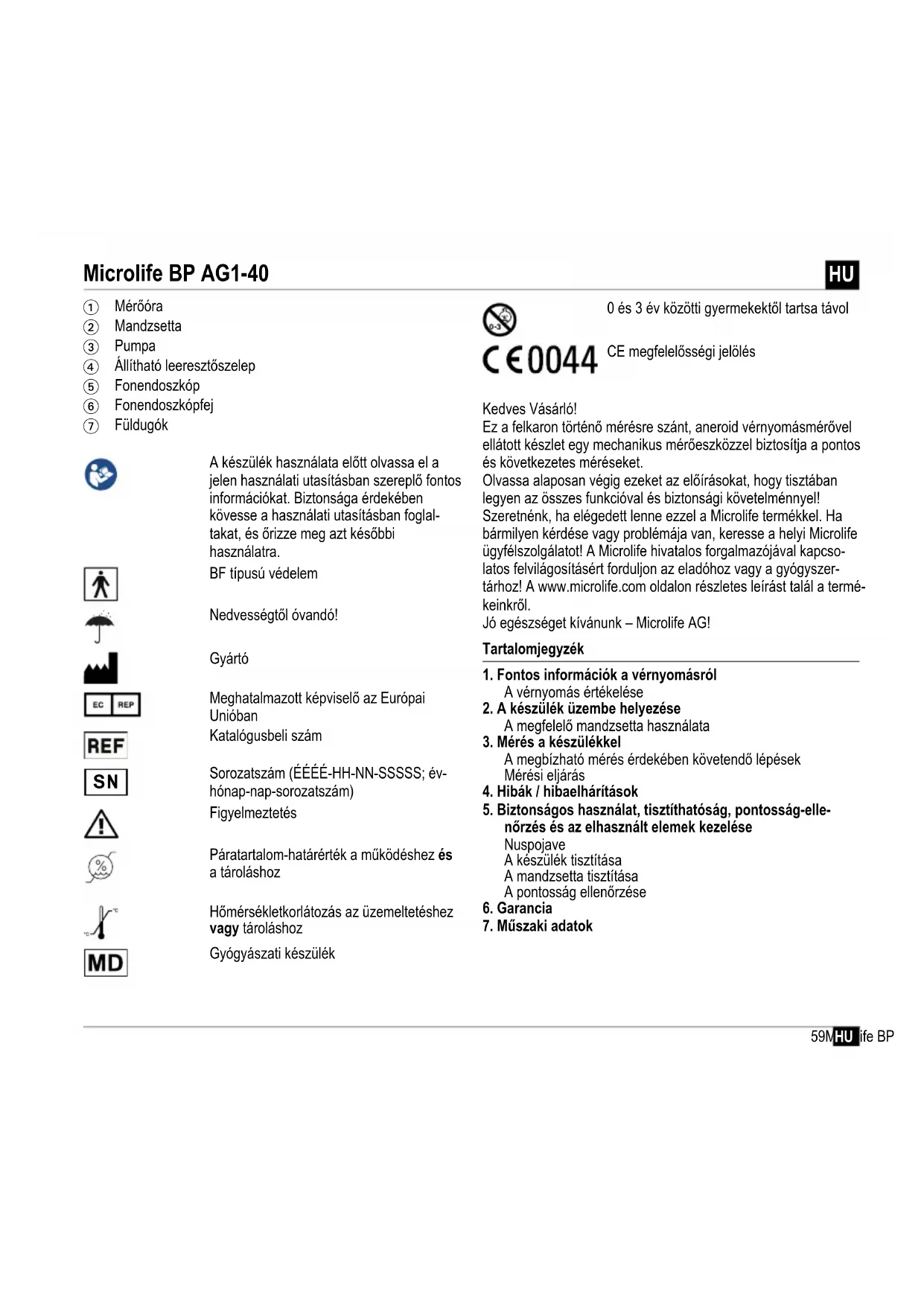 Ha a mérési eredményeket szokatlannak tartja, akkor olvassa el alaposan az «1.» részt! Biztonság és védelem Leírás Lehetséges ok és a hiba kiküszöbölése Gyermekek csak felügyelet mellett használhatják a készüléket, mert annak kisebb alkotóelemeit esetleg lenyel- hetik. Legyen tisztában annak veszélyével, hogy ha a készülékhez vezetékek, csövek tartoznak, azok fulladást okozhatnak! Ellenjavallatok63Microlife BP AG1-40