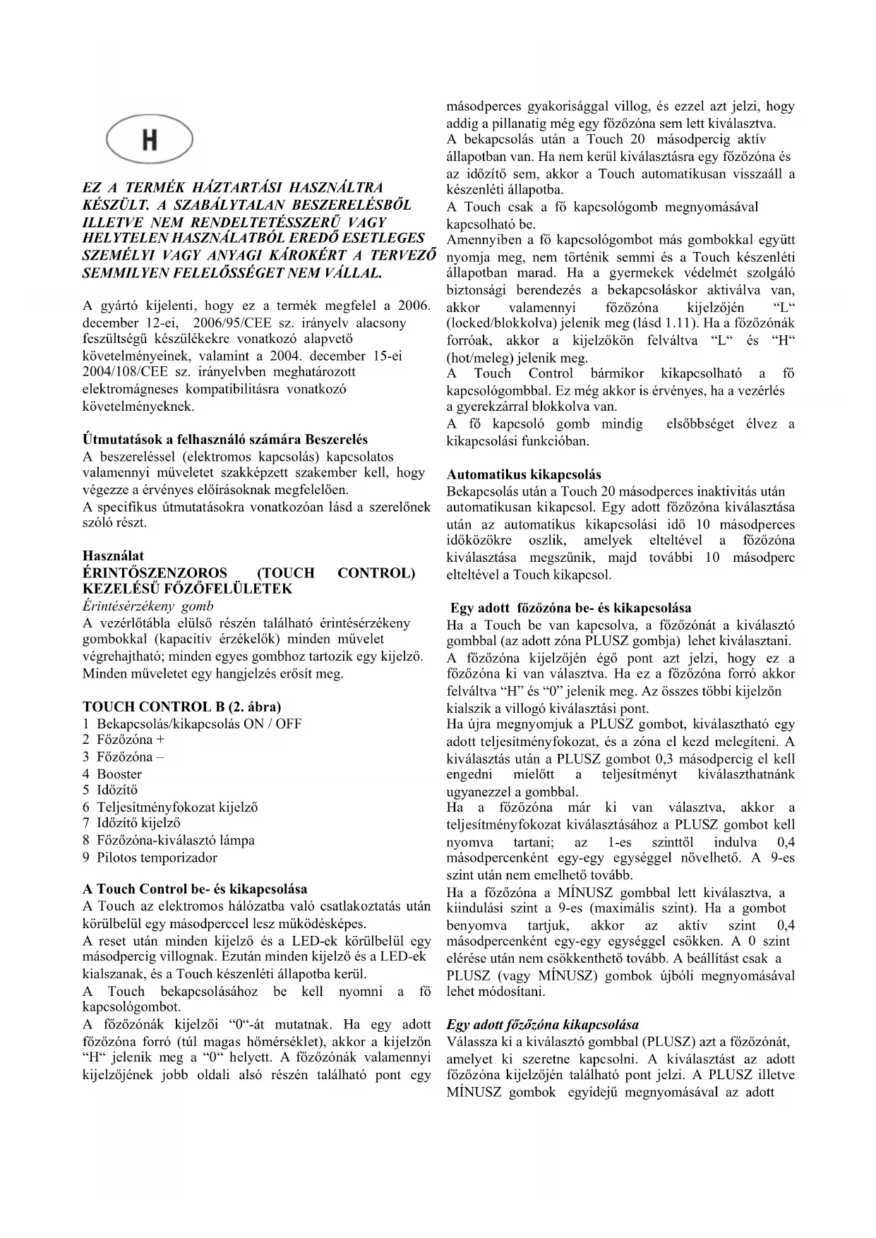 ha a főzőzóna forró egy “H” jelenik meg; ellenkező esetben