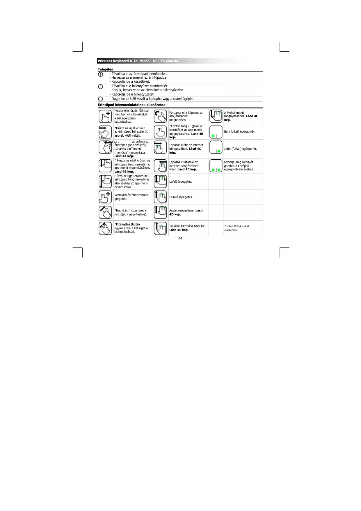 - Húzza az ujját erősen az érintőpad felső széléről; az app menü megnyitásához. Lásd 4B kép. Lapozás visszafelé az internet böngészőben wser. Lásd 4C kép. Nyomja meg mindkét gombot a középső egérgomb eléréséhez. Húzza az ujját erősen az érintőpad felső széléről az alsó széléig az app menü bezárásához. Lefelé lépegetés. Vertikális és *horizontális görgetés. Felfelé lépegetés. *Nagyítás (húzza szét a két ujját a nagyításhoz). Asztal megnyitása. Lásd 4D kép.