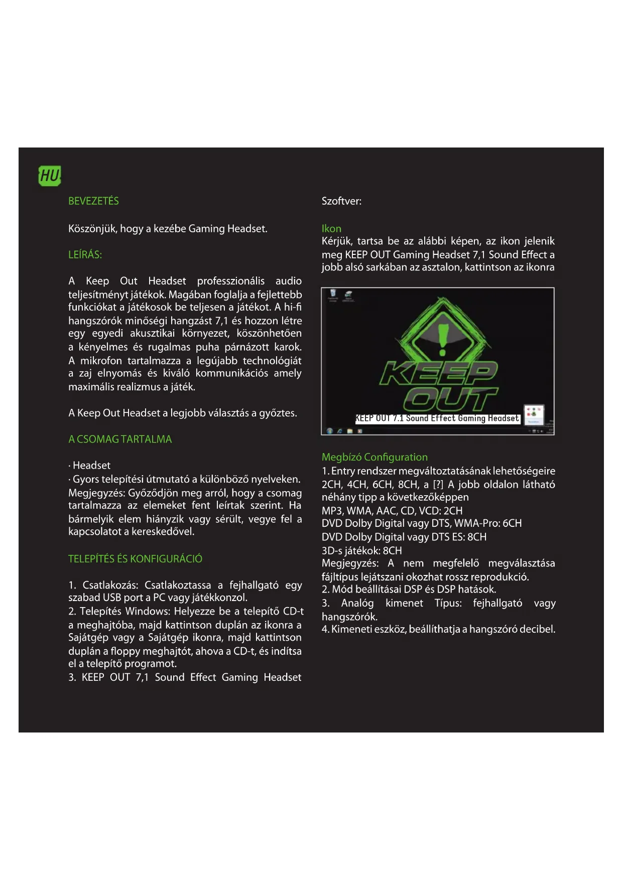 A Keep Out Headset professionalis audio teljesitmenyt jatekok. Magaban foglalja a fejletebb funkciokat a jatekosok be teljesen a jatekot. A hi-fi hangszorok minosegi hangzast 7,1 es hozzon letre egy egyedi akusztkai kornyezet, koszönhetoen a kenyelmes es rugalmas puha parnazott karok. A mikrofon tartalmazza a legujabb technologiat a zaj elnyomás es kivaló kommuníciós amely maximális realizmus a jatek.