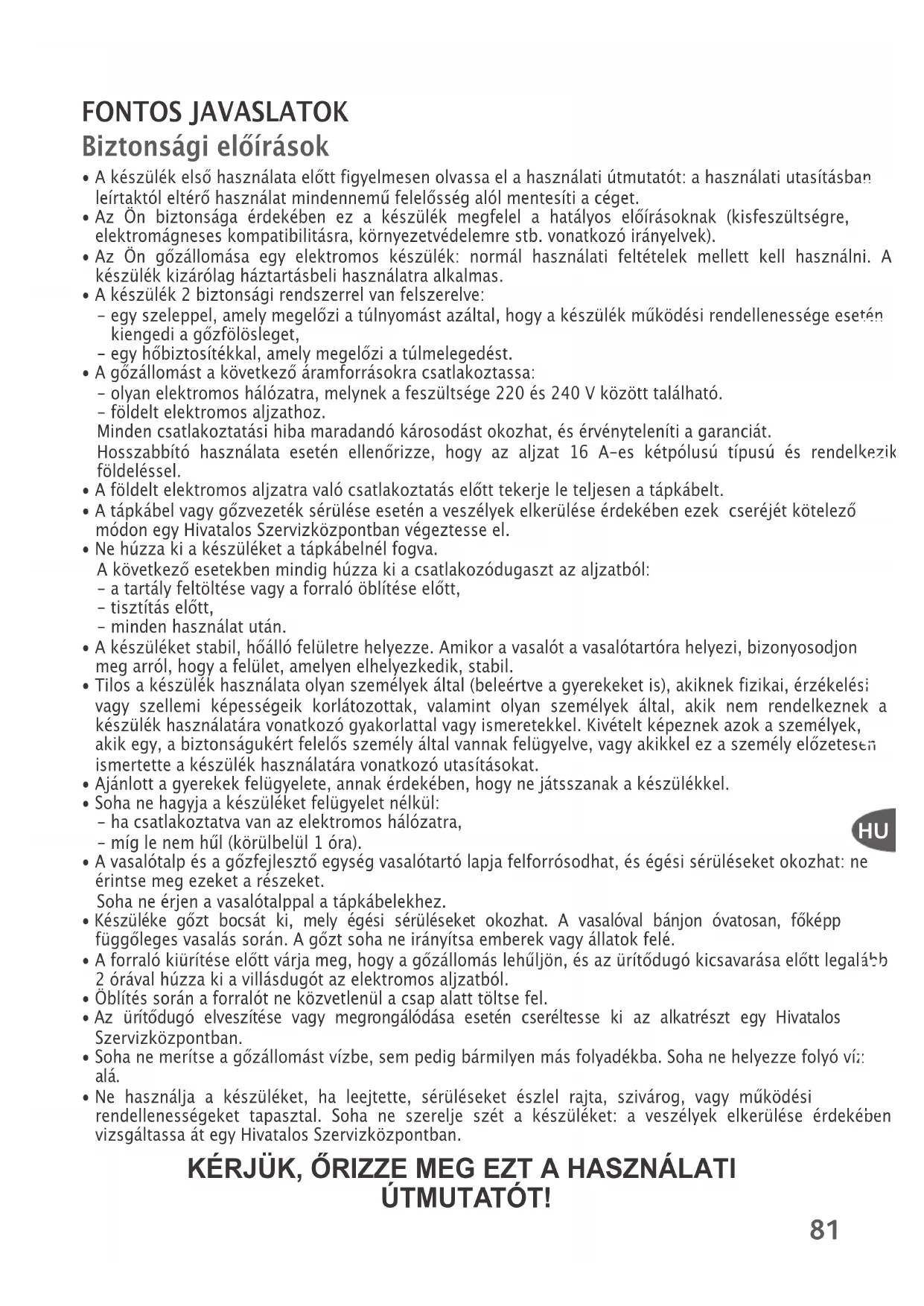 készülék kizárólag háztartásbeli használatra alkalmas.