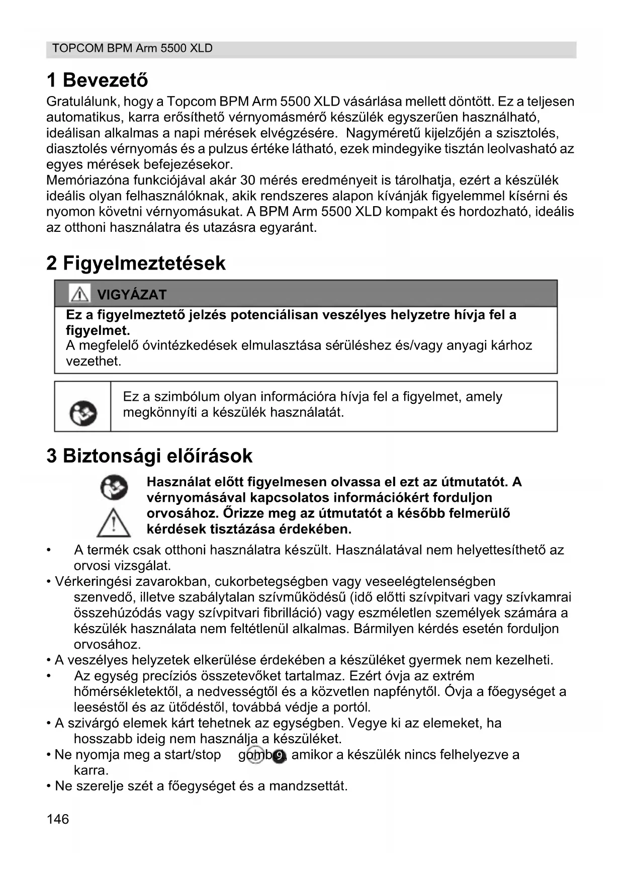 οφείλεται στη χρήση μη επαναφορτιζόμενων μπαταριών. Η εγγύηση δεν καλύπτει τυχόν βλάβη η οποία οφείλεται σε εξωτερικούς παράγοντες, όπως αστραπή, νερό και φωτιά, ούτε βλάβη που προκύπτει κατά τη μεταφορά της μονάδας. ∆εν μπορεί να εγερθεί αξίωση εγγύησης εάν ο σειριακός αριθμός των μονάδων μεταβληθεί, αφαιρεθεί ή καταστεί δυσανάγνωστος. Οποιεσδήποτε αξιώσεις εγγύησης θεωρούνται μη έγκυρες σε περίπτωση που η μονάδα έχει επισκευαστεί, αλλοιωθεί ή τροποποιηθεί από τον αγοραστή ή από μη επίσημα εξουσιοδοτημένο κέντρο τεχνικής υποστήριξης της Topcom.146 TOPCOM BPM Arm 5500 XLD 1 Bevezető Gratulálunk, hogy a Topcom BPM Arm 5500 XLD vásárlása mellett döntött. Ez a teljesen automatikus, karra erősíthető vérnyomásmérő készülék egyszerűen használható, ideálisan alkalmas a napi mérések elvégzésére. Nagyméretű kijelzőjén a szisztolés, diasztolés vérnyomás és a pulzus értéke látható, ezek mindegyike tisztán leolvasható az egyes mérések befejezésekor. Memóriazóna funkciójával akár 30 mérés eredményeit is tárolhatja, ezért a készülék ideális olyan felhasználóknak, akik rendszeres alapon kívánják figyelemmel kísérni és nyomon követni vérnyomásukat. A BPM Arm 5500 XLD kompakt és hordozható, ideális az otthoni használatra és utazásra egyaránt. 2 Figyelmeztetések 3 Biztonsági előírások