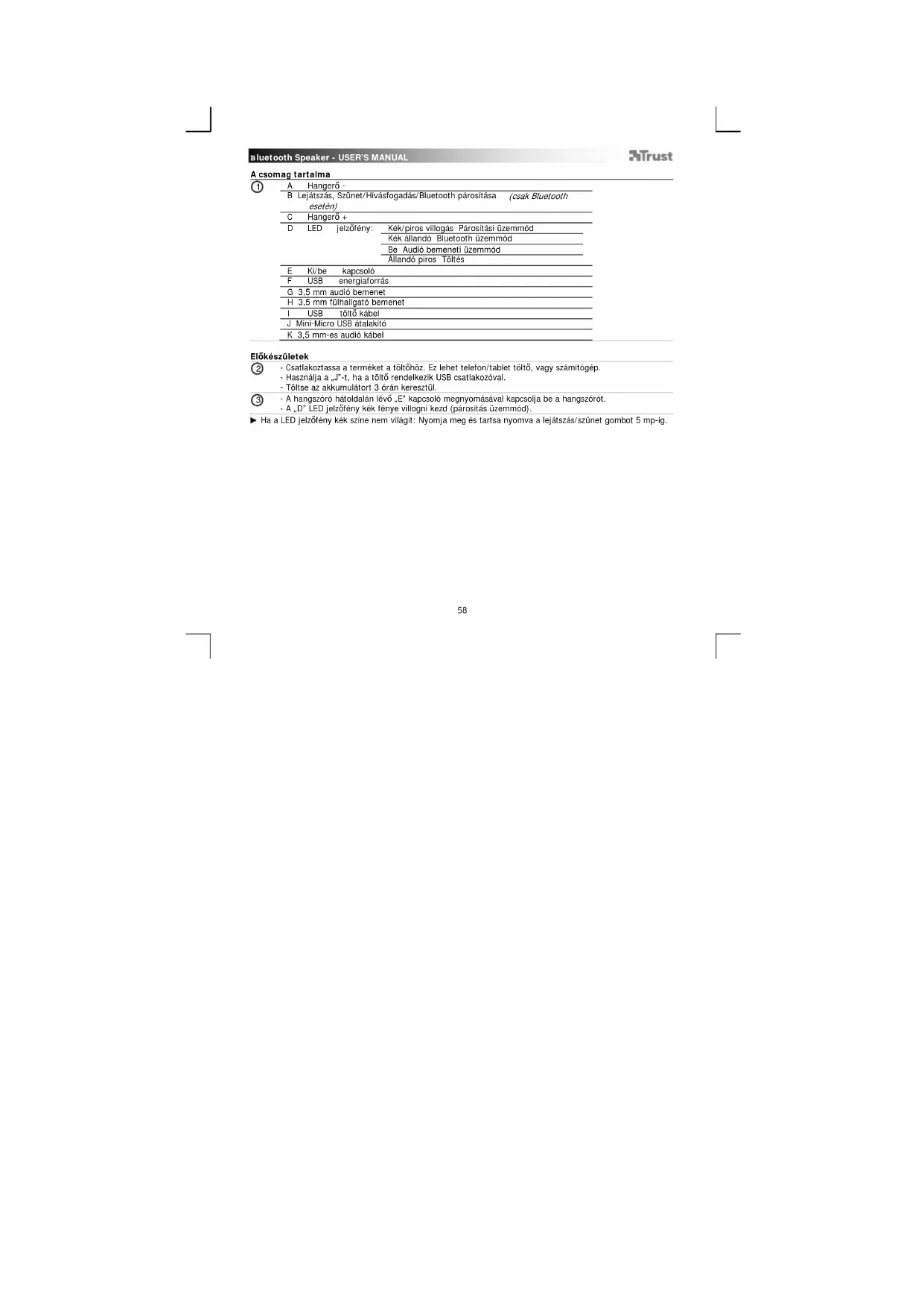 - Ellenőrizze, hogy készülékén engedélyezte a Bluetooth használatát. - Bluetooth használatakor ellenőrizze, hogy nincs audió kábel csatlakoztatva a 3,5 mm-es audió bemenetbe. - Ismételje meg a készüléke szabvány konfigurálási beállításait. (iPad/iPhone, Android, Windows, Mac) - A BT hangszóró túl messze van a készülékétől. (ideális körülmények között a maximális távolság 10 méter) - Amennyiben a terméket nagyméretű fémfelületek közelében használja, távolítsa el a fém felületet, vagy vigye távolabb a terméket a fémfelülettől. - A falak és a padló jelentős mértékben csökkenti a termék hatótávolságát. Helyezze a BT hangszórót közelebb az audió forráshoz. - Vigye a BT hangszórót távolabb más vezeték-nélküli készülékektől. (mint a vezeték-nélküli hálózati router-ek, egér és klaviatúra) Torz hang Alacsony hangerő - Ellenőrizze a készüléke hangerő-beállításait. (Tablet, Smartphone) Amennyiben a problémája nem oldódik meg, kérjük, lépjen kapcsolatba az ügyfélszolgálatunkkal a www.trust.com/19275/faq honlapon keresztül.Bluetooth Speaker - USER’S MANUAL