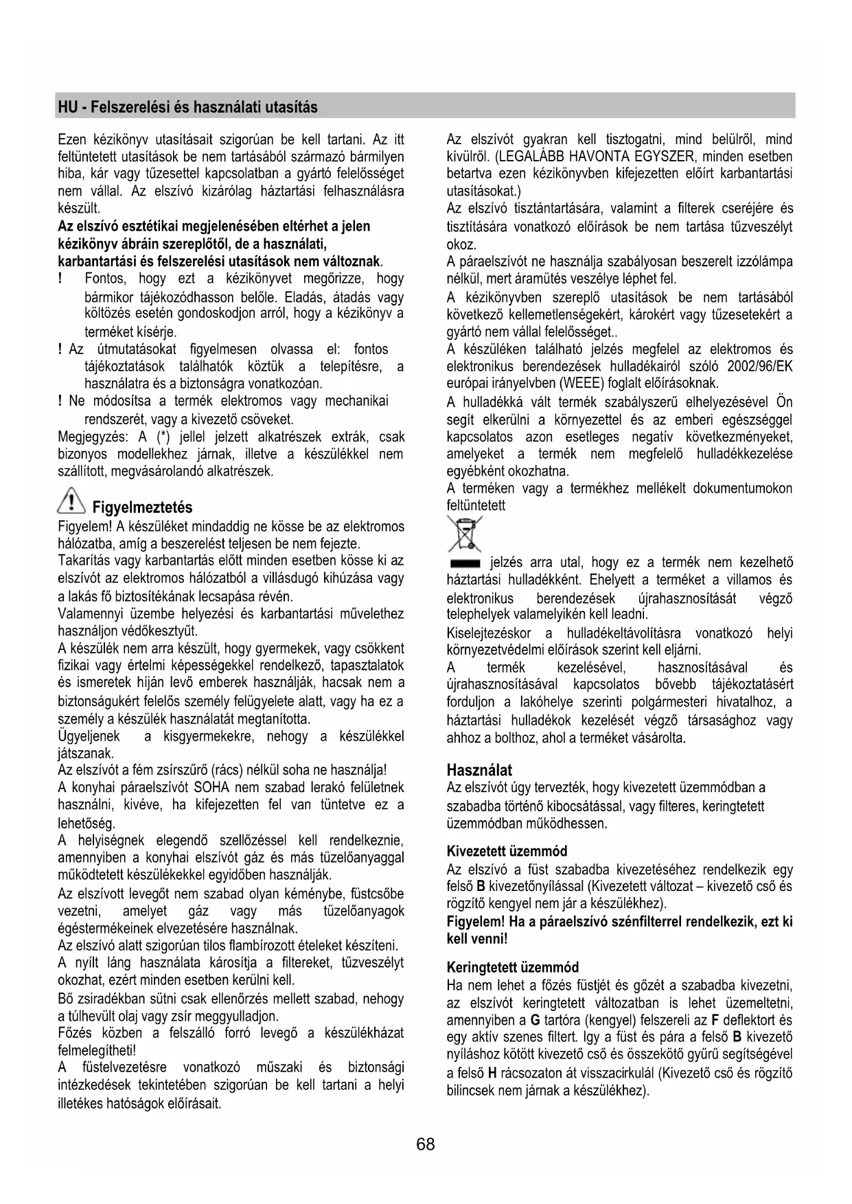 Dacă plafoniera nu se aprinde, controlaţi dacă aţi introdus bine becurile înainte de a chema Asistenţa tehnică.68 HU - Felszerelési és használati utasítás Ezen kézikönyv utasításait szigorúan be kell tartani. Az itt feltüntetett utasítások be nem tartásából származó bármilyen hiba, kár vagy tűzesettel kapcsolatban a gyártó felelősséget nem vállal. Az elszívó kizárólag háztartási felhasználásra készült. Az elszívó esztétikai megjelenésében eltérhet a jelen kézikönyv ábráin szereplőtől, de a használati, karbantartási és felszerelési utasítások nem változnak. ! Fontos, hogy ezt a kézikönyvet megőrizze, hogy bármikor tájékozódhasson belőle. Eladás, átadás vagy költözés esetén gondoskodjon arról, hogy a kézikönyv a terméket kísérje. ! Az útmutatásokat figyelmesen olvassa el: fontos tájékoztatások találhatók köztük a telepítésre, a használatra és a biztonságra vonatkozóan. ! Ne módosítsa a termék elektromos vagy mechanikai rendszerét, vagy a kivezető csöveket. Megjegyzés: A (*) jellel jelzett alkatrészek extrák, csak bizonyos modellekhez járnak, illetve a készülékkel nem szállított, megvásárolandó alkatrészek. Figyelmeztetés Figyelem! A készüléket mindaddig ne kösse be az elektromos hálózatba, amíg a beszerelést teljesen be nem fejezte. Takarítás vagy karbantartás előtt minden esetben kösse ki az elszívót az elektromos hálózatból a villásdugó kihúzása vagy a lakás fő biztosítékának lecsapása révén. Valamennyi üzembe helyezési és karbantartási művelethez használjon védőkesztyűt. A készülék nem arra készült, hogy gyermekek, vagy csökkent fizikai vagy értelmi képességekkel rendelkező, tapasztalatok és ismeretek híján levő emberek használják, hacsak nem a biztonságukért felelős személy felügyelete alatt, vagy ha ez a személy a készülék használatát megtanította. Ügyeljenek a kisgyermekekre, nehogy a készülékkel játszanak. Az elszívót a fém zsírszűrő (rács) nélkül soha ne használja! A konyhai páraelszívót SOHA nem szabad lerakó felületnek használni, kivéve, ha kifejezetten fel van tüntetve ez a lehetőség. A helyiségnek elegendő szellőzéssel kell rendelkeznie, amennyiben a konyhai elszívót gáz és más tüzelőanyaggal működtetett készülékekkel egyidőben használják. Az elszívott levegőt nem szabad olyan kéménybe, füstcsőbe vezetni, amelyet gáz vagy más tüzelőanyagok égéstermékeinek elvezetésére használnak. Az elszívó alatt szigorúan tilos flambírozott ételeket készíteni. A nyílt láng használata károsítja a filtereket, tűzveszélyt okozhat, ezért minden esetben kerülni kell. Bő zsiradékban sütni csak ellenőrzés mellett szabad, nehogy a túlhevült olaj vagy zsír meggyulladjon. Főzés közben a felszálló forró levegő a készülékházat felmelegítheti! A füstelvezetésre vonatkozó műszaki és biztonsági intézkedések tekintetében szigorúan be kell tartani a helyi illetékes hatóságok előírásait. Az elszívót gyakran kell tisztogatni, mind belülről, mind kívülről. (LEGALÁBB HAVONTA EGYSZER, minden esetben betartva ezen kézikönyvben kifejezetten előírt karbantartási utasításokat.) Az elszívó tisztántartására, valamint a filterek cseréjére és tisztítására vonatkozó előírások be nem tartása tűzveszélyt okoz. A páraelszívót ne használja szabályosan beszerelt izzólámpa nélkül, mert áramütés veszélye léphet fel. A kézikönyvben szereplő utasítások be nem tartásából következő kellemetlenségekért, károkért vagy tűzesetekért a gyártó nem vállal felelő sséget.. A készüléken található jelzés megfelel az elektromos és elektronikus berendezések hulladékairól szóló 2002/96/EK európai irányelvben (WEEE) foglalt előírásoknak. A hulladékká vált termék szabályszerű elhelyezésével Ön segít elkerülni a környezettel és az emberi egészséggel kapcsolatos azon esetleges negatív következményeket, amelyeket a termék nem megfelelő hulladékkezelése egyébként okozhatna. A terméken vagy a termékhez mellékelt dokumentumokon feltüntetett jelzés arra utal, hogy ez a termék nem kezelhető háztartási hulladékként. Ehelyett a terméket a villamos és elektronikus berendezések újrahasznosítását végző telephelyek valamelyikén kell leadni. Kiselejtezéskor a hulladékeltávolításra vonatkozó helyi környezetvédelmi előírások szerint kell eljárni. A termék kezelésével, hasznosításával és újrahasznosításával kapcsolatos bővebb tájékoztatásért forduljon a lakóhelye szerinti polgármesteri hivatalhoz, a háztartási hulladékok kezelését végző társasághoz vagy ahhoz a bolthoz, ahol a terméket vásárolta. Használat Az elszívót úgy tervezték, hogy kivezetett üzemmódban a szabadba történő kibocsátással, vagy filteres, keringtetett üzemmódban működhessen. Kivezetett üzemmód Az elszívó a füst szabadba kivezetéséhez rendelkezik egy felső B kivezetőnyílással (Kivezetett változat – kivezető cső és rögzítő kengyel nem jár a készülékhez). Figyelem! Ha a páraelszívó szénfilterrel rendelkezik, ezt ki kell venni! Keringtetett üzemmód Ha nem lehet a főzés füstjét és gőzét a szabadba kivezetni, az elszívót keringtetett változatban is lehet üzemeltetni, amennyiben a G tartóra (kengyel) felszereli az F deflektort és egy aktív szenes filtert. Igy a füst és pára a felső B kivezető nyíláshoz kötött kivezető cső és összekötő gyűrű segítségével a felső H rácsozaton át visszacirkulál (Kivezető cső és rögzítő bilincsek nem járnak a készülékhez).69 Figyelem! Ha a páraelszívó szénfilterrel nem rendelkezik, ezt meg kell rendelni, és használatba vétel előtt fel kell szerelni. Az elszívó motor nélküli modellek csak kivezetett változatban m