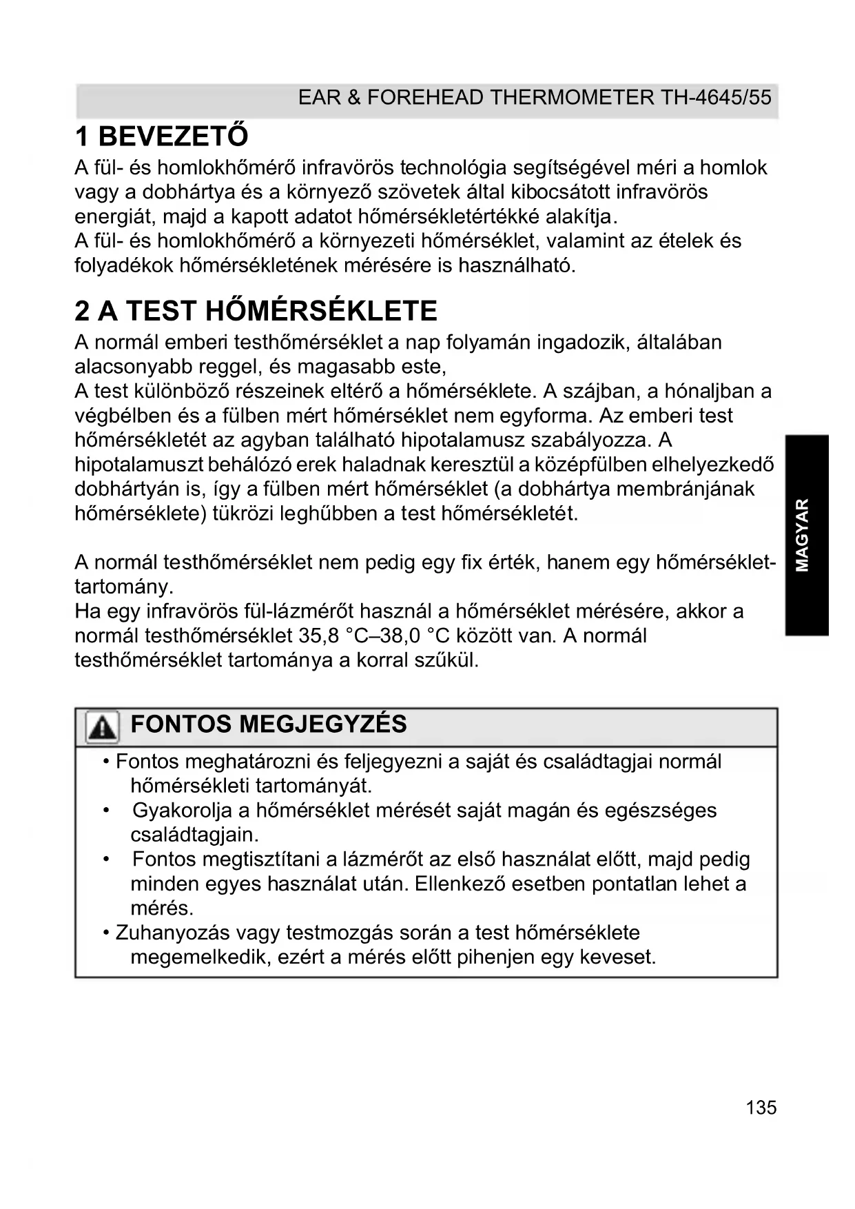MAGYAR 1 BEVEZETŐ A fül- és homlokhőmérő infravörös technológia segítségével méri a homlok vagy a dobhártya és a környező szövetek által kibocsátott infravörös energiát, majd a kapott adatot hőmérsékletértékké alakítja. A fül- és homlokhőmérő a környezeti hőmérséklet, valamint az ételek és folyadékok hőmérsékletének mérésére is használható.