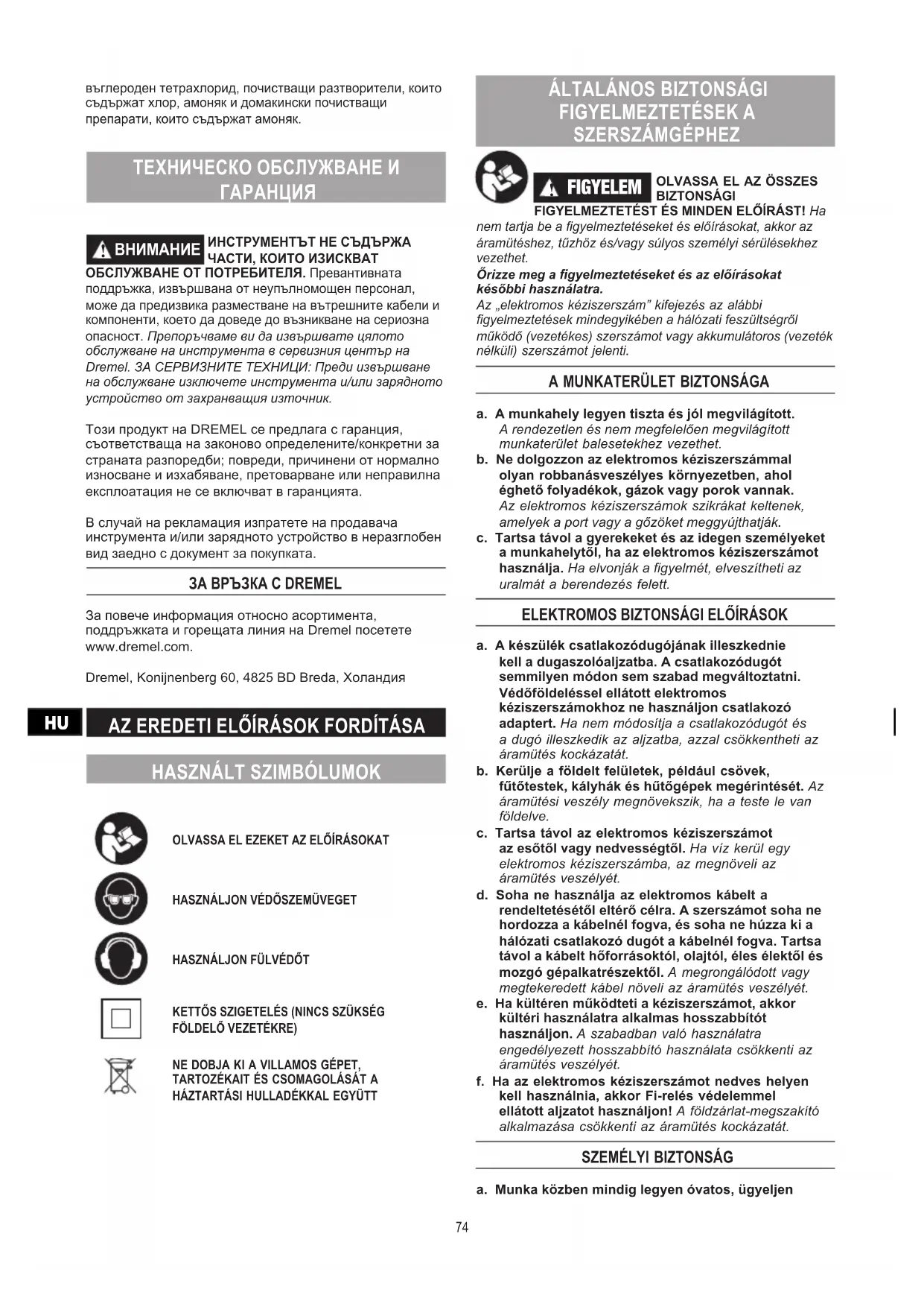 FIGYELEM FELHASZNÁLÓ ÁLTAL NEM JAVÍTHATÓ BELSŐ ALKATRÉSZEKET TARTALMAZ. A jogosulatlan személy által végzett megelőző karbantartás a belső vezetékek és alkatrészek rossz helyre történő bekötésével komoly veszélyt okozhat. Azt ajánljuk, hogy a szerszám javítását bízza Dremel szervizközpontra. SZERVIZES SZAKEMBEREKNEK: A javítás előtt szüntesse meg a szerszám és/vagy a töltő csatlakozását az áramforráshoz.A DREMEL termék garanciája megfelel a törvényi, illetve országspecikus előírásoknak; a normális használatból eredő kopás és elhasználódás, túlterhelés és helytelen kezelés miatt bekövetkező károsodásokra a garancia nem terjed ki.Panasz esetén küldje vissza a szerszámot vagy a töltőt szétszerelés nélkül a vásárlást igazoló dokumentumokkal együtt a kereskedőhöz. A DREMEL ELÉRHETŐSÉGEI A Dremel termékválasztékával, támogatásával és bármilyen kérdéssel kapcsolatban a www.dremel.com címen talál információt. Dremel, Konijnenberg 60, 4825 BD Breda, Hollandia