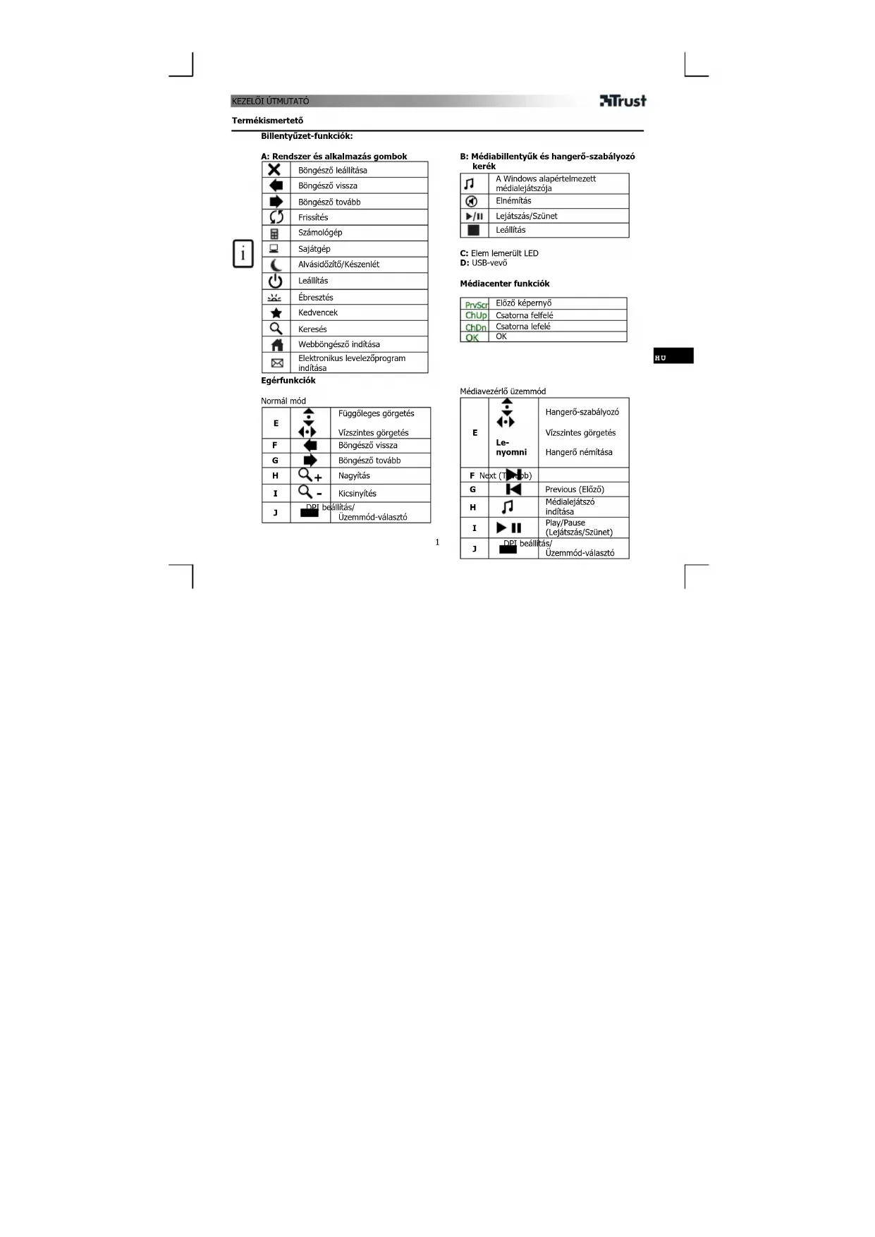 Termékismertető Billentyűzet-funkciók: A: Rendszer és alkalmazás gombok Böngésző leállítása Böngésző vissza Böngésző tovább Frissítés Számológép Sajátgép Alvásidőzítő/Készenlét Leállítás Ébresztés Kedvencek Keresés Webböngésző indítása Elektronikus levelezőprogram indítása