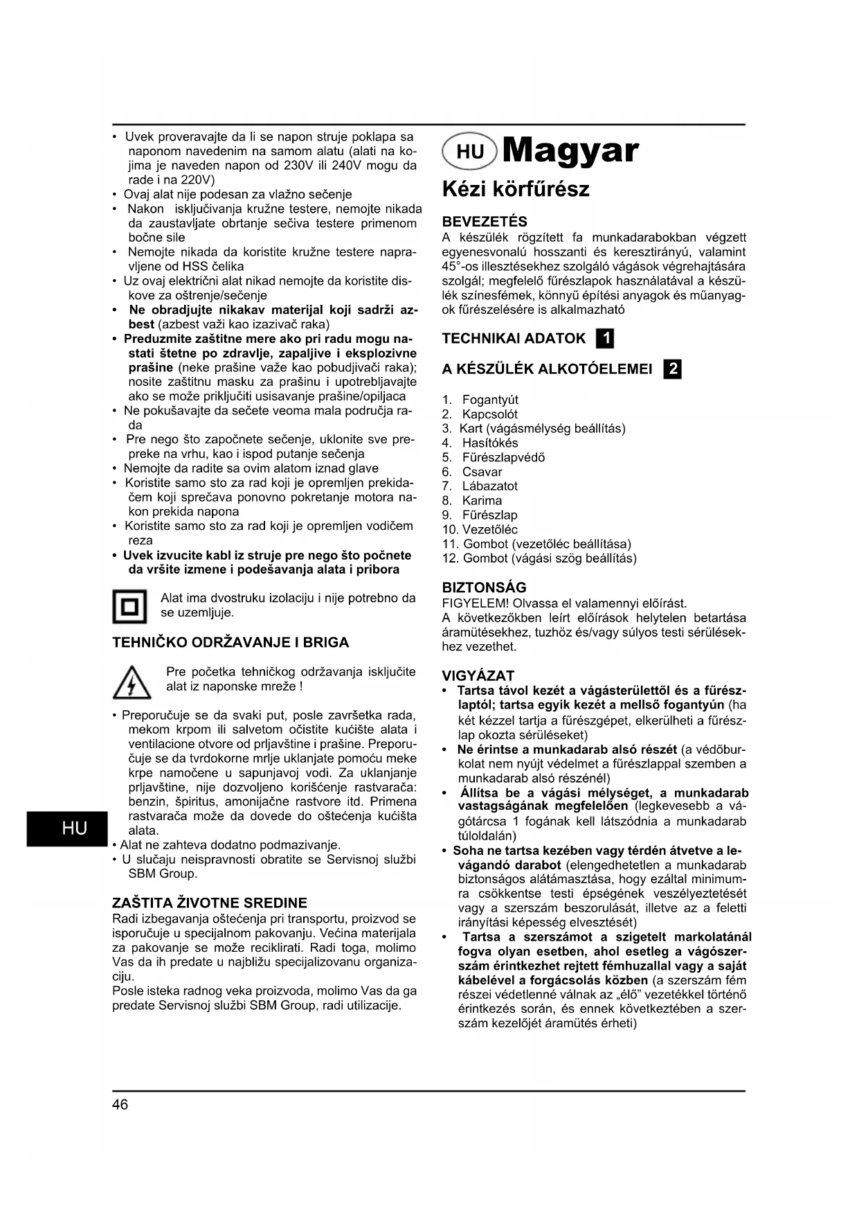 Kézi körfűrész BEVEZETÉSA készülék rögzített fa munkadarabokban végzett egyenesvonalú hosszanti és keresztirányú, valamint 45°-os illesztésekhez szolgáló vágások végrehajtására szolgál; megfelelő fűrészlapok használatával a készü- lék színesfémek, könnyű építési anyagok és műanyag- ok fűrészelésére is alkalmazhatóTECHNIKAI ADATOK 1 A KÉSZÜLÉK ALKOTÓELEMEI 2 1. Fogantyút2. Kapcsolót3. Kart (vágásmélység beállítás)4. Hasítókés5. Fűrészlapvédő6. Csavar7. Lábazatot8. Karima9. Fűrészlap10. Vezetőléc11. Gombot (vezetőléc beállítása)12. Gombot (vágási szög beállítás)BIZTONSÁGFIGYELEM! Olvassa el valamennyi előírást. A következőkben leírt előírások helytelen betartása áramütésekhez, tuzhöz és/vagy súlyos testi sérülések-hez vezethet. VIGYÁZAT