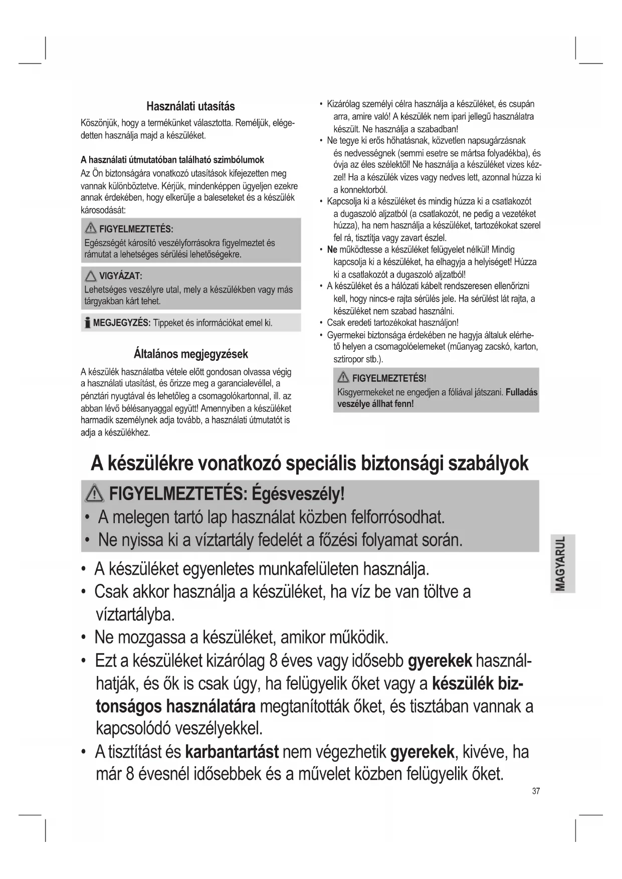 • A tisztítást és karbantartást nem végezhetik gyerekek, kivéve, ha