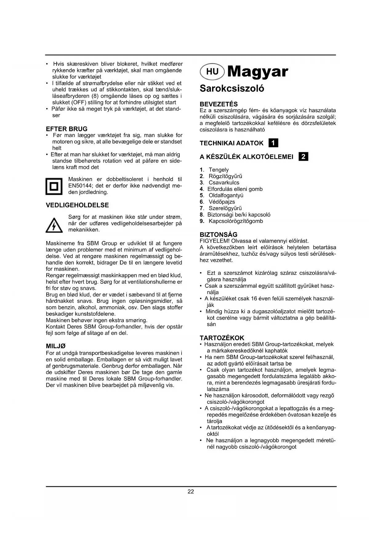 - Miután kikapcsolta a készüléket, a tartozék forgását sose annak síkjára merőleges erővel állítsa meg A készülék az EN50144 rendelkezéssel össz- hangban duplán szigetelt, emiatt földelésre nincs szükség. KARBANTARTÁS Győződjön meg róla, hogy a készülék nincs áram, alatt amikor a motoron karbantartási munkát végez. A SBM Group készülékeket hosszú élettartamra és mi- nimális karbantartási igénnyel tervezték. A folyamatos, kielégítő működés a rendszeres ápoláson és tisztításon múlik. Rendszeresen, lehetőleg minden használat után puha ronggyal tisztítsa le a készülék házát. A szellőzőnyílá- sokat óvja portól és szennyeződéstől. Használjon szap- panos vízzel megnedvesített puha rongyot, ha a szeny- nyeződést nem lehet eltávolítani. Soha ne használjon oldószereket pl. petróleumot, alkoholt, ammóniás vizet stb. Az oldószerek károsíthatják a műanyag részeket. A készülék nem igényel kiegészítő kenést. Ha meghibásodást észlel, keresse fel helyi SBM Group viszonteladóját.