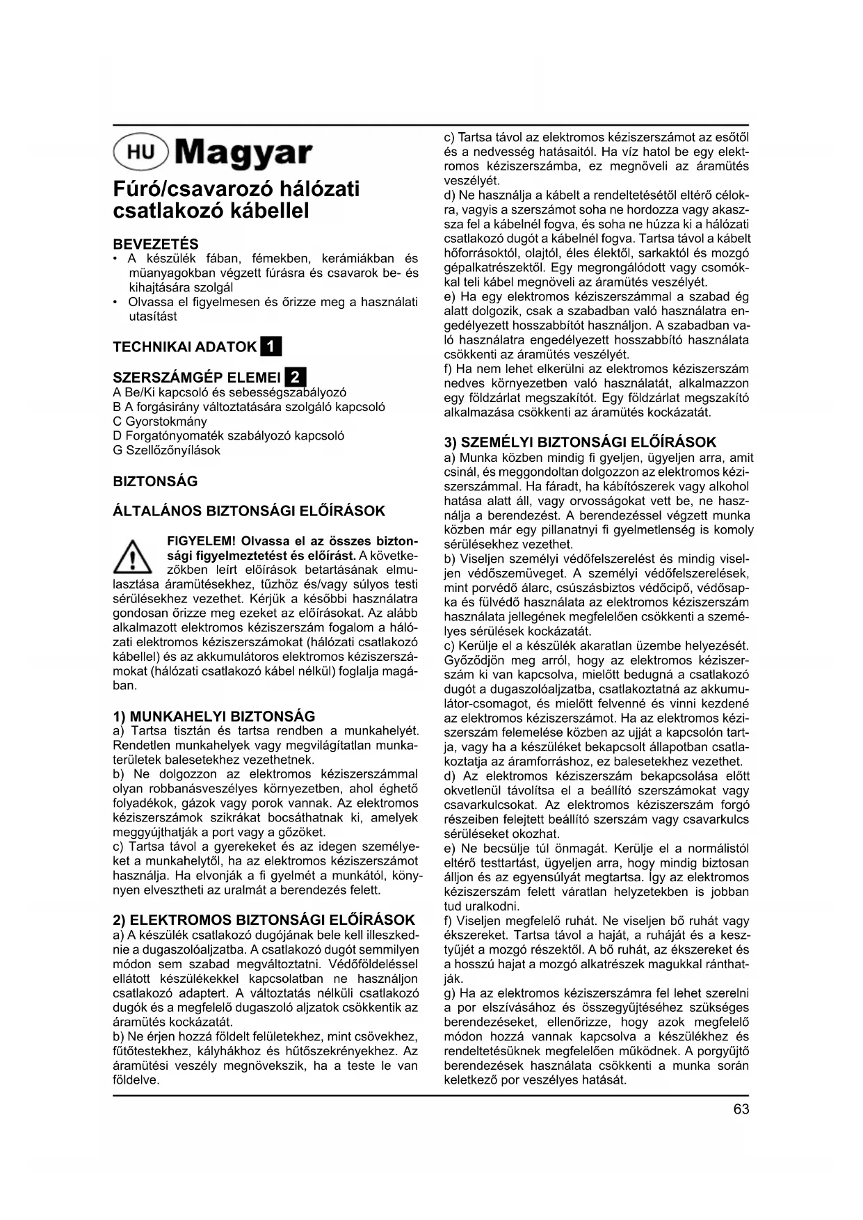 A Be/Ki kapcsoló és sebességszabályozó B A forgásirány változtatására szolgáló kapcsoló C Gyorstokmány D Forgatónyomaték szabályozó kapcsoló G Szellőzőnyílások BIZTONSÁG ÁLTALÁNOS BIZTONSÁGI ELŐÍRÁSOK FIGYELEM! Olvassa el az összes bizton- sági fi gyelmeztetést és előírást. A követke- zőkben leírt előírások betartásának elmu- lasztása áramütésekhez, tűzhöz és/vagy súlyos testi sérülésekhez vezethet. Kérjük a későbbi használatra gondosan őrizze meg ezeket az előírásokat. Az alább alkalmazott elektromos kéziszerszám fogalom a háló- zati elektromos kéziszerszámokat (hálózati csatlakozó kábellel) és az akkumulátoros elektromos kéziszerszá- mokat (hálózati csatlakozó kábel nélkül) foglalja magá- ban.