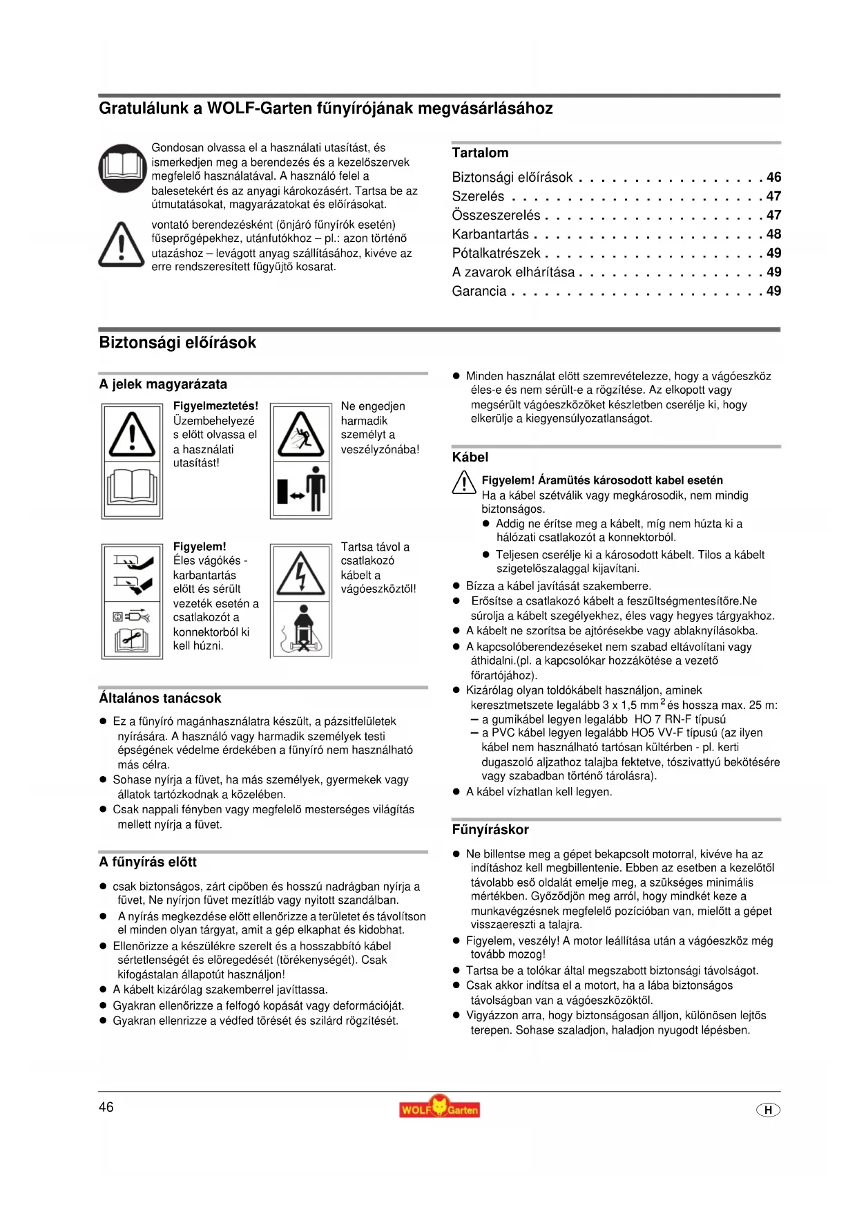 - Gratulálunk a WOLF-Garten főnyírójának megvásárlásához Tartalom Biztonsági elıírások p. 46