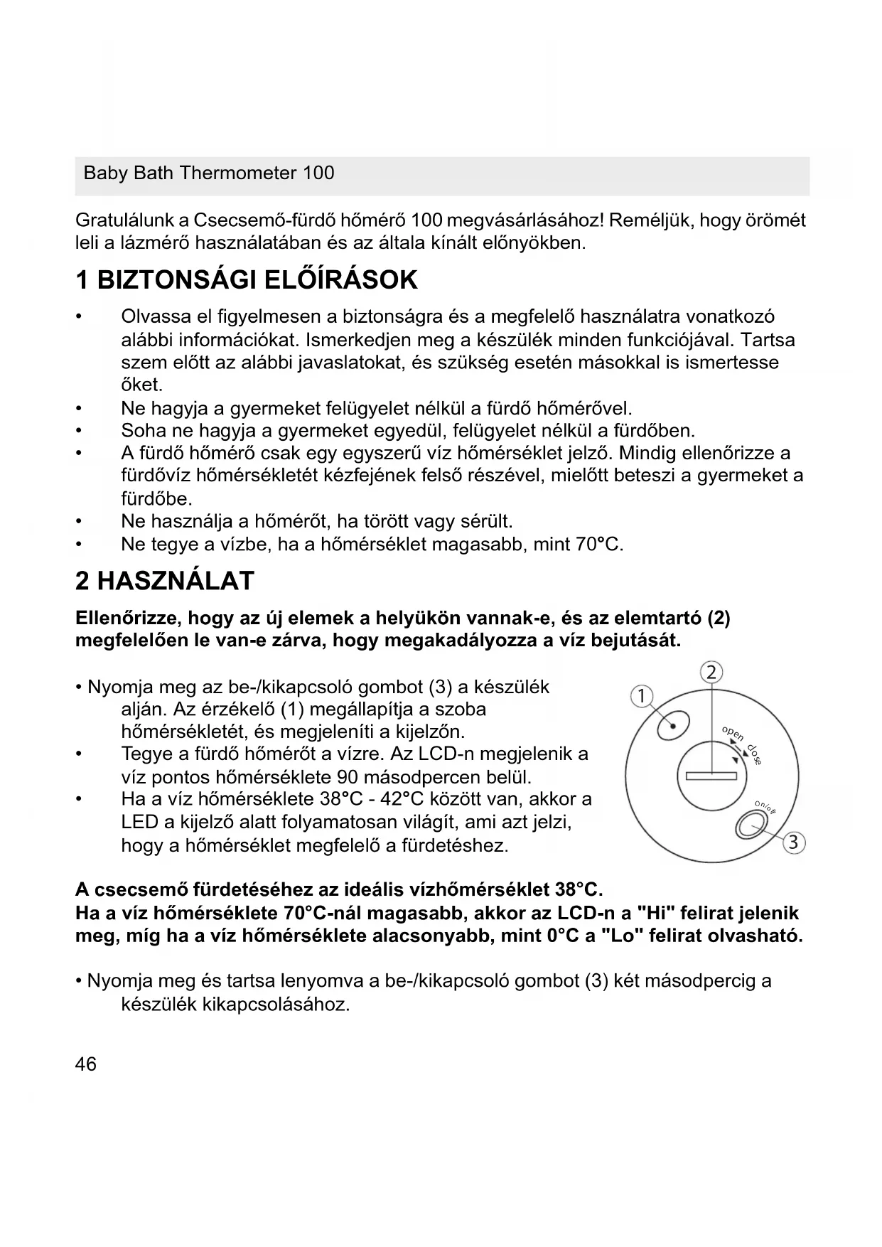 Gratulálunk a CsecsemĘ-fürdĘ hĘmérĘ 100 megvásárlásához! Reméljük, hogy örömét leli a lázmérĘ használatában és az általa kínált elĘnyökben. 1 BIZTONSÁGI ELėÍRÁSOK