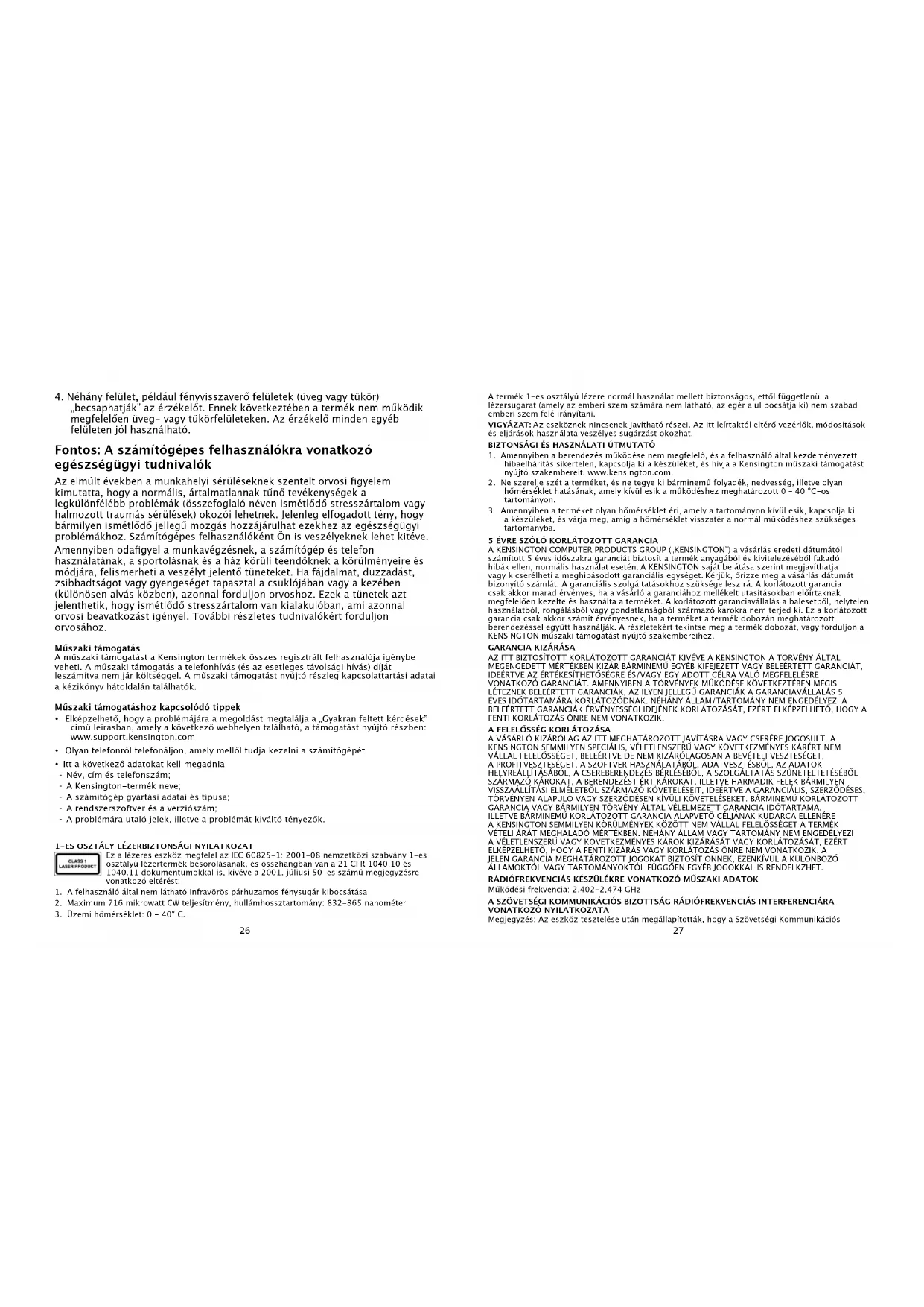 - Itt a következő adatokat kell megadnia: - Név, cím és telefonszám; - A Kensington-termék neve; - A számítógép gyártási adatai és típusa; - A rendszerszoftver és a verziószám; - A problémára utaló jelek, illetve a problémát kiváltó tényezők. 1-ES OSZTÁLY LÉZERBIZTONSÁGI NYILATKOZAT Ez a lézeres eszköz megfelel az IEC 60825-1: 2001-08 nemzetközi szabvány 1-es osztályú lézertermék besorolásának, és összhangban van a 21 CFR 1040.10 és 1040.11 dokumentumokkal is, kivéve a 2001. júliusi 50-es számú megjegyzésre vonatkozó eltérést: