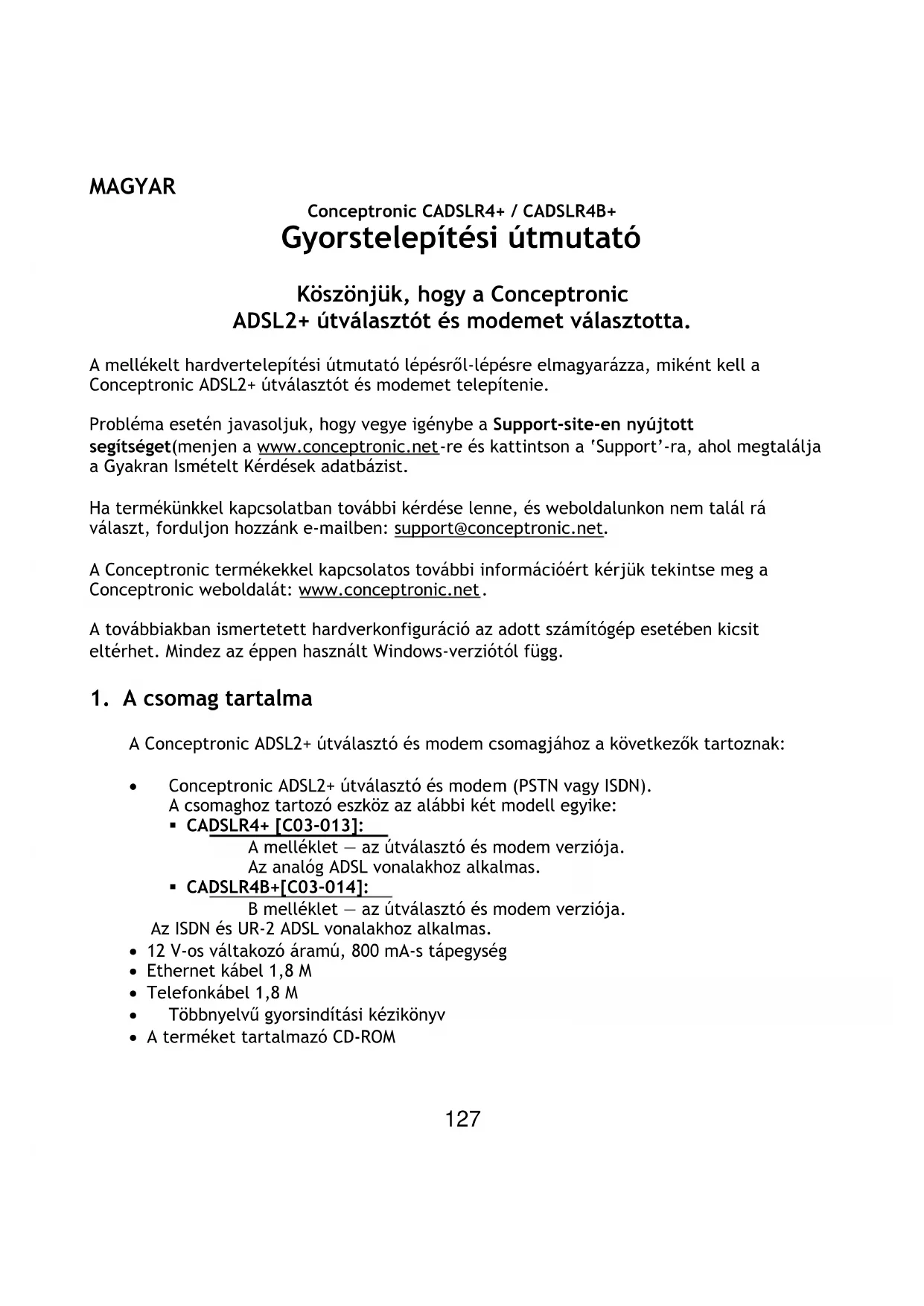 Conceptronic CADSLR4+ / CADSLR4B+ Gyorstelepítési útmutató Köszönjük, hogy a Conceptronic ADSL2+ útválasztót és modemet választotta. A mellékelt hardvertelepítési útmutató lépésről-lépésre elmagyarázza, miként kell a Conceptronic ADSL2+ útválasztót és modemet telepítenie. Probléma esetén javasoljuk, hogy vegye igénybe a Support-site-en nyújtott segítséget(menjen a www.conceptronic.net -re és kattintson a ‘Support’-ra, ahol megtalálja a Gyakran Ismételt Kérdések adatbázist. Ha termékünkkel kapcsolatban további kérdése lenne, és weboldalunkon nem talál rá választ, forduljon hozzánk e-mailben: support@conceptronic.net