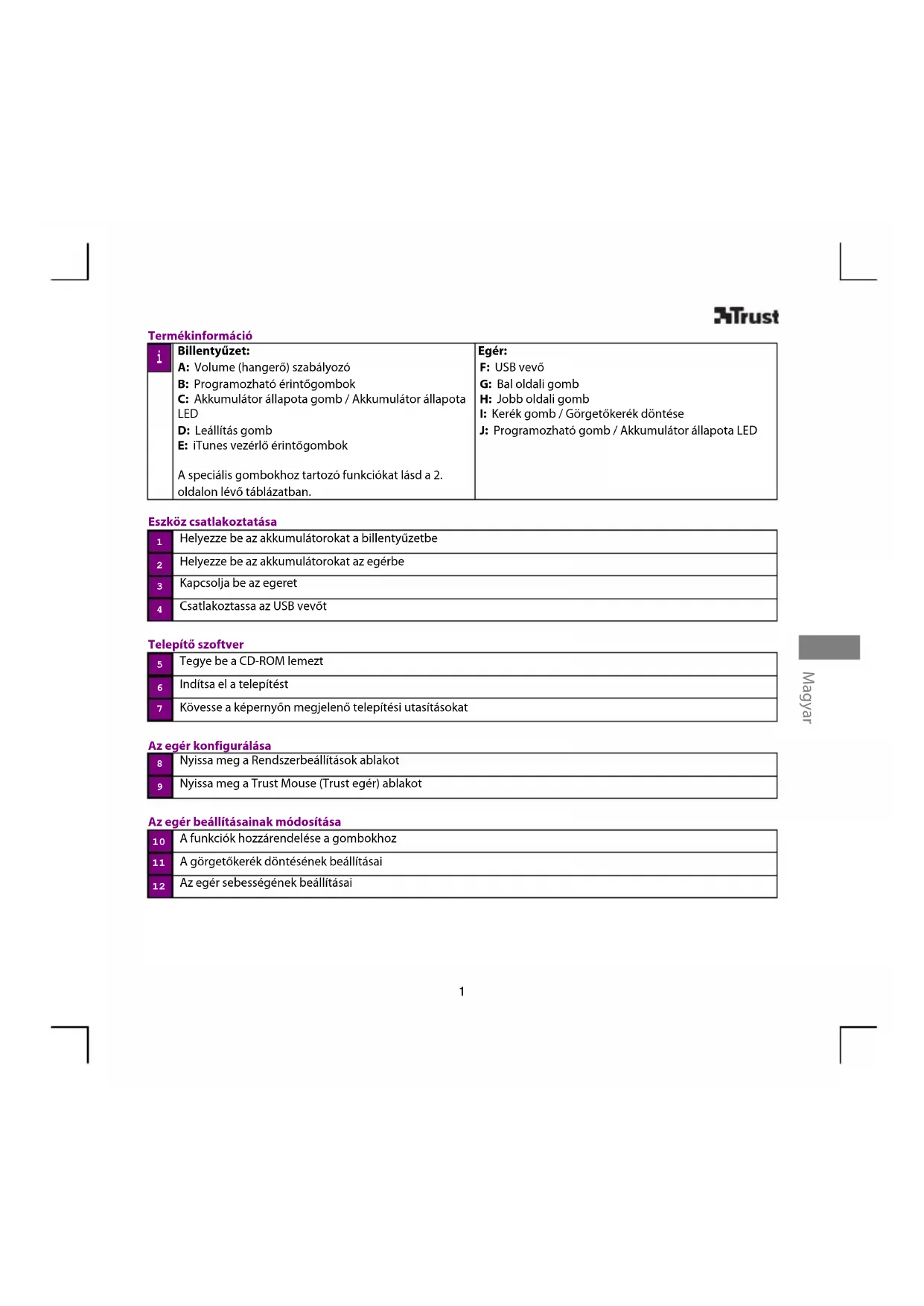 Termékinformáció Billentyűzet: A: Volume (hangerő) szabályozó B: Programozható érintőgombok C: Akkumulátor állapota gomb / Akkumulátor állapota LED D: Leállítás gomb E: iTunes vezérlő érintőgombok A speciális gombokhoz tartozó funkciókat lásd a 2. oldalon lévő táblázatban. Egér: F: USB vevő G: Bal oldali gomb H: Jobb oldali gomb I: Kerék gomb / Görgetőkerék döntése J: Programozható gomb / Akkumulátor állapota LED Eszköz csatlakoztatása Helyezze be az akkumulátorokat a billentyűzetbe Helyezze be az akkumulátorokat az egérbe Kapcsolja be az egeret Csatlakoztassa az USB vevőt Telepítő szoftver Tegye be a CD-ROM lemezt Indítsa el a telepítést Kövesse a képernyőn megjelenő telepítési utasításokat Az egér konfigurálása Nyissa meg a Rendszerbeállítások ablakot Nyissa meg a Trust Mouse (Trust egér) ablakot Az egér beállításainak módosítása A funkciók hozzárendelése a gombokhoz A görgetőkerék döntésének beállításai Az egér sebességének beállításai