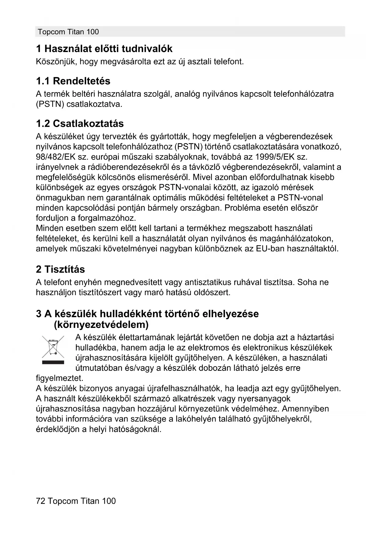 A készüléket úgy tervezték és gyártották, hogy megfeleljen a végberendezések nyilvános kapcsolt telefonhálózathoz (PSTN) történÏ csatlakoztatására vonatkozó, 98/482/EK sz. európai mÐszaki szabályoknak, továbbá az 1999/5/EK sz. irányelvnek a rádióberendezésekrÏl és a távközlÏ végberendezésekrÏl, valamint a megfelelÏségük kölcsönös elismerésérÏl. Mivel azonban elÏfordulhatnak kisebb különbségek az egyes országok PSTN-vonalai között, az igazoló mérések önmagukban nem garantálnak optimális mÐködési feltételeket a PSTN-vonal minden kapcsolódási pontján bármely országban. Probléma esetén elÏször forduljon a forgalmazóhoz. Minden esetben szem elÏtt kell tartani a termékhez megszabott használati feltételeket, és kerülni kell a használatát olyan nyilvános és magánhálózatokon, amelyek mÐszaki követelményei nagyban különböznek az EU-ban használtaktól. 2 Tisztítás A telefont enyhén megnedvesített vagy antisztatikus ruhával tisztítsa. Soha ne használjon tisztítószert vagy maró hatású oldószert. 3 A készülék hulladékként történº elhelyezése (környezetvédelem) A készülék élettartamának lejártát követÏen ne dobja azt a háztartási hulladékba, hanem adja le az elektromos és elektronikus készülékek újrahasznosítására kijelölt gyÐjtÏhelyen. A készüléken, a használati útmutatóban és/vagy a készülék dobozán látható jelzés erre figyelmeztet. A készülék bizonyos anyagai újrafelhasználhatók, ha leadja azt egy gyÐjtÏhelyen. A használt készülékekbÏl származó alkatrészek vagy nyersanyagok újrahasznosítása nagyban hozzájárul környezetünk védelméhez. Amennyiben további információra van szüksége a lakóhelyén található gyÐjtÏhelyekrÏl, érdeklÏdjön a helyi hatóságoknál.Topcom Titan 100 73 Topcom Titan 100 MAGYAR 4 Biztonsági tanácsok