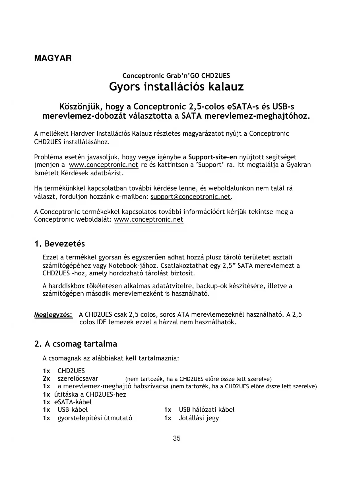 Köszönjuk, hogy a Conceptronic 2,5-colos eSATA-s és USB-s merevlemez-dobozát valasztotta a SATA merevlemez-meghajtóhoz.