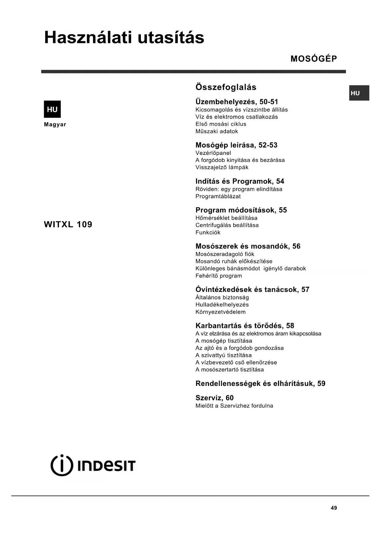 Találja meg az eszköz kézikönyvét ingyenesen WITXL 109 INDESIT PDF formátumban.