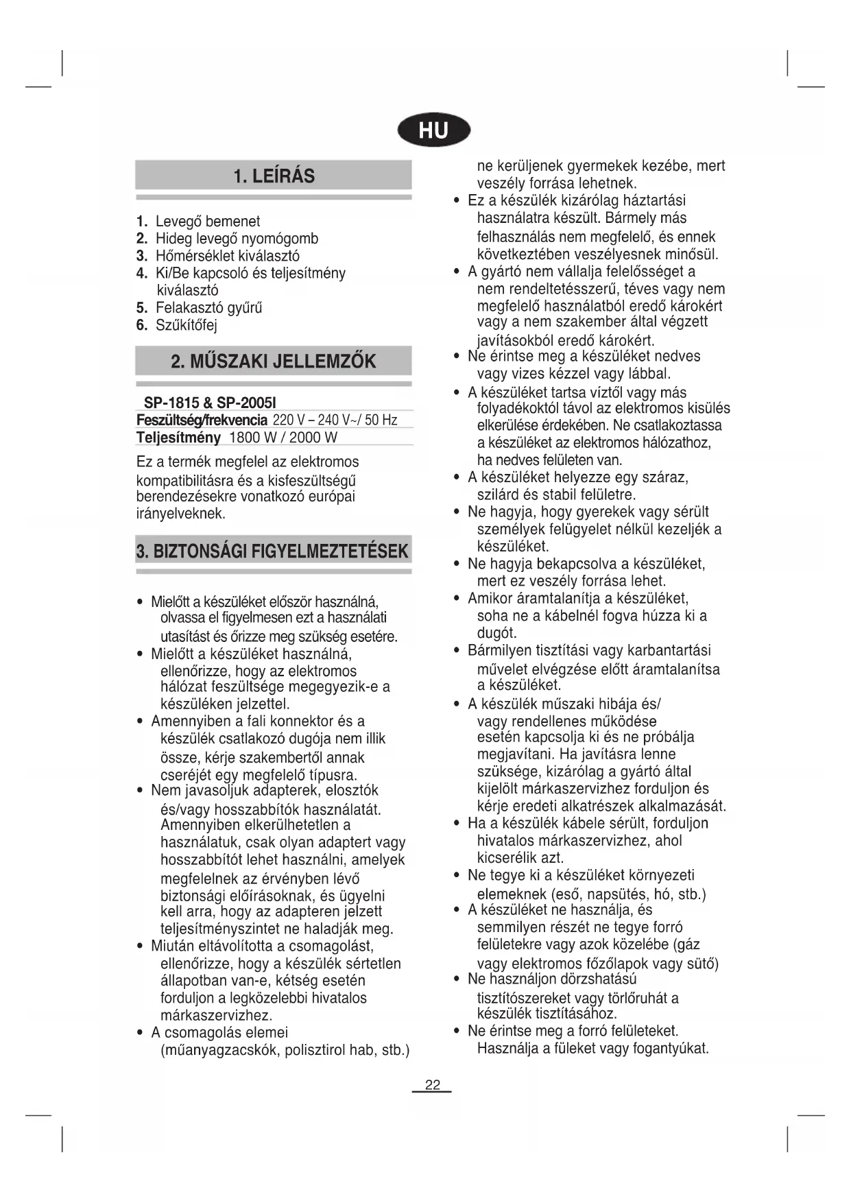 Ez a termék megfelel az elektromos kompatibilitásra és a kisfeszültségű berendezésekre vonatkozó európai irányelveknek. SP-1815 & SP-2005I Feszültség/frekvencia 220 V – 240 V~/ 50 Hz Teljesítmény 1800 W / 2000 W23