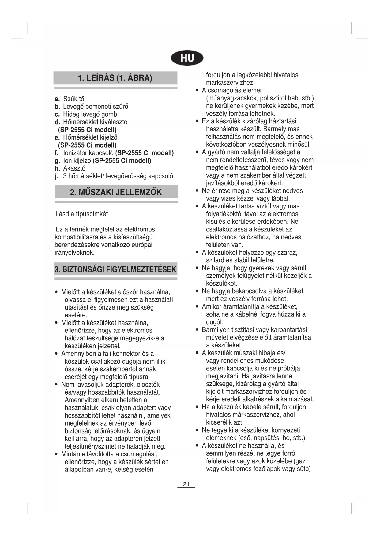 = Kikapcsolt készülék Hőmérséklet kiválasztó (SP-2555 Ci modell) (d): A hőmérséklet kiválasztó segítségével 3 teljesítményszintet választhat ki (alacsony, közepes, nagy) és ezzel együtt az üzemi hőmérsékletet is (2. Ábra). A narancssárga kijelző (e) világít. Hideg levegő gomb (c): A hideg levegő nyomógombbal csökkentheti a levegő hőmérsékletét, függetlenül a kapcsoló helyzetétől. Gyors lehűtést tesz lehetővé. Ionizáló (SP-2555 Ci modell) (f): Ez a funkció fényessé teszi haját, valamint védi a levegő elektrosztatikus terhelésétől. A funkció aktiválásához kapcsolja be az ionizáló kapcsolót (f) és a fényjelzés világít (g) (3. Ábra).23