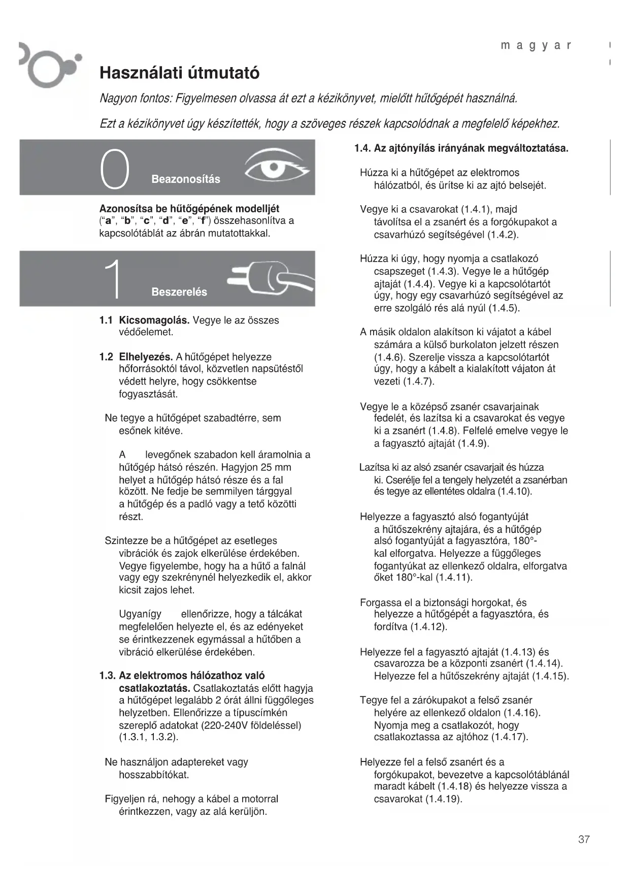 csatlakoztatás. Csatlakoztatás elott hagyj a hütögépet legalább 2 orat allni fuggoleges helyzetben. Ellenőrizes a típuscímkén szereplő adatokat (220-240V foldeléssel) (1.3.1, 1.3.2).