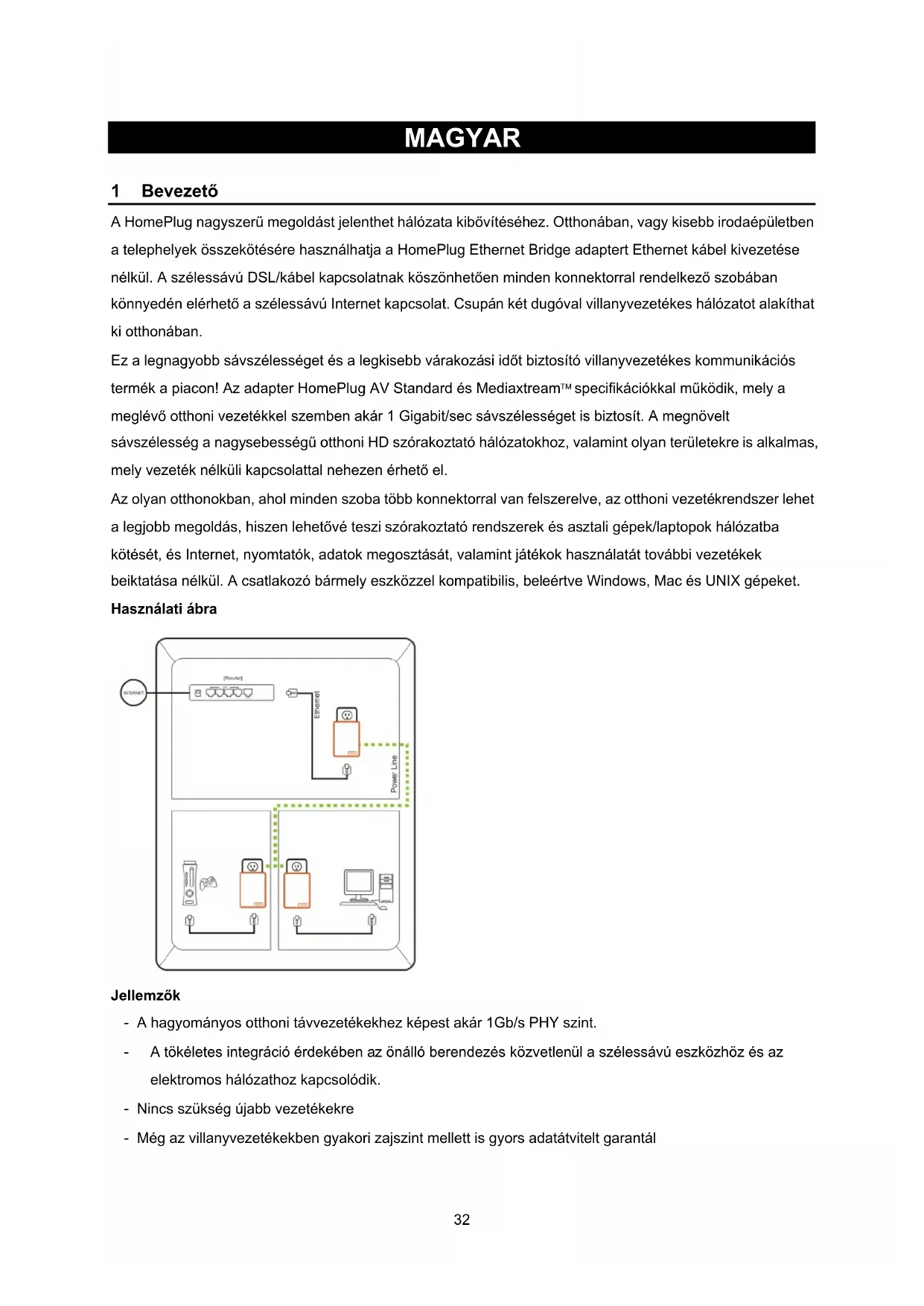 31MAGYAR HomePlug 1 Bevezető A HomePlug nagyszerű megoldást jelenthet hálózata kibővítéséhez. Otthonában, vagy kisebb irodaépületben a telephelyek összekötésére használhatja a HomePlug Ethernet Bridge adaptert Ethernet kábel kivezetése nélkül. A szélessávú DSL/kábel kapcsolatnak köszönhetően minden konnektorral rendelkező szobában könnyedén elérhető a szélessávú Internet kapcsolat. Csupán két dugóval villanyvezetékes hálózatot alakíthat ki otthonában. Ez a legnagyobb sávszélességet és a legkisebb várakozási időt biztosító villanyvezetékes kommunikációs termék a piacon! Az adapter HomePlug AV Standard és Mediaxtream