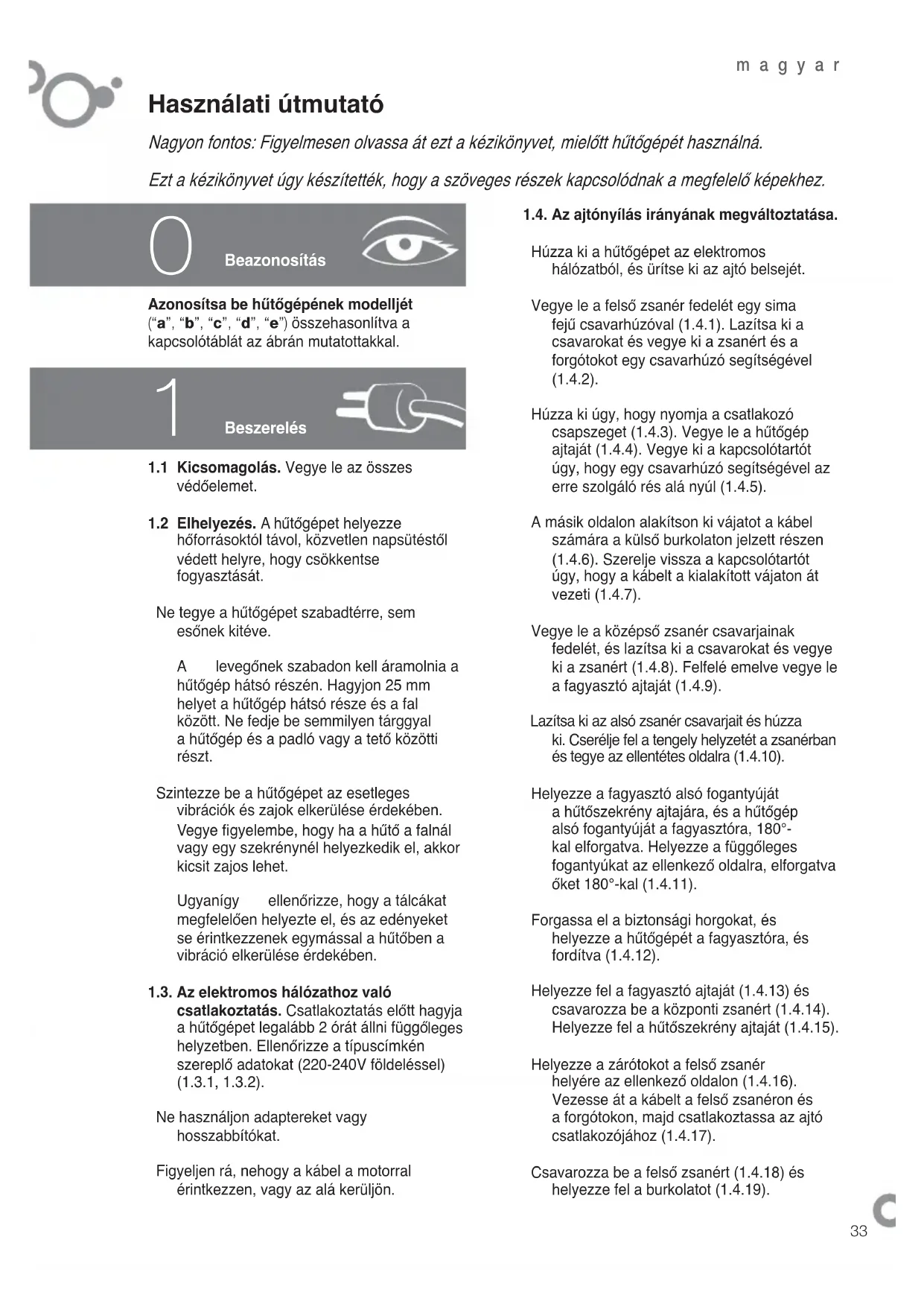 Beazonosítás 1.4. Az ajtónyílás irányának megváltoztatása. Húzza ki a hűtőgépet az elektromos hálózatból, és ürítse ki az ajtó belsejét. Vegye le a felső zsanér fedelét egy sima fejű csavarhúzóval (1.4.1). Lazítsa ki a csavarokat és vegye ki a zsanért és a forgótokot egy csavarhúzó segítségével (1.4.2). Húzza ki úgy, hogy nyomja a csatlakozó csapszeget (1.4.3). Vegye le a hűtőgép ajtaját (1.4.4). Vegye ki a kapcsolótartót úgy, hogy egy csavarhúzó segítségével az erre szolgáló rés alá nyúl (1.4.5). A másik oldalon alakítson ki vájatot a kábel számára a külső burkolaton jelzett részen (1.4.6). Szerelje vissza a kapcsolótartót úgy, hogy a kábelt a kialakított vájaton át vezeti (1.4.7). Vegye le a középső zsanér csavarjainak fedelét, és lazítsa ki a csavarokat és vegye ki a zsanért (1.4.8). Felfelé emelve vegye le a fagyasztó ajtaját (1.4.9). Lazítsa ki az alsó zsanér csavarjait és húzza ki. Cserélje fel a tengely helyzetét a zsanérban és tegye az ellentétes oldalra (1.4.10). Helyezze a fagyasztó alsó fogantyúját a hűtőszekrény ajtajára, és a hűtőgép alsó fogantyúját a fagyasztóra, 180°-kal elforgatva. Helyezze a függőleges fogantyúkat az ellenkező oldalra, elforgatva őket 180°-kal (1.4.11). Forgassa el a biztonsági horgokat, és helyezze a hűtőgépét a fagyasztóra, és fordítva (1.4.12). Helyezze fel a fagyasztó ajtaját (1.4.13) és csavarozza be a központi zsanért (1.4.14). Helyezze fel a hűtőszekrény ajtaját (1.4.15). Helyezze a zárótokot a felső zsanér helyére az ellenkező oldalon (1.4.16). Vezesse át a kábelt a felső zsanéron és a forgótokon, majd csatlakoztassa az ajtó csatlakozójához (1.4.17). Csavarozza be a felső zsanért (1.4.18) és helyezze fel a burkolatot (1.4.19).magyar