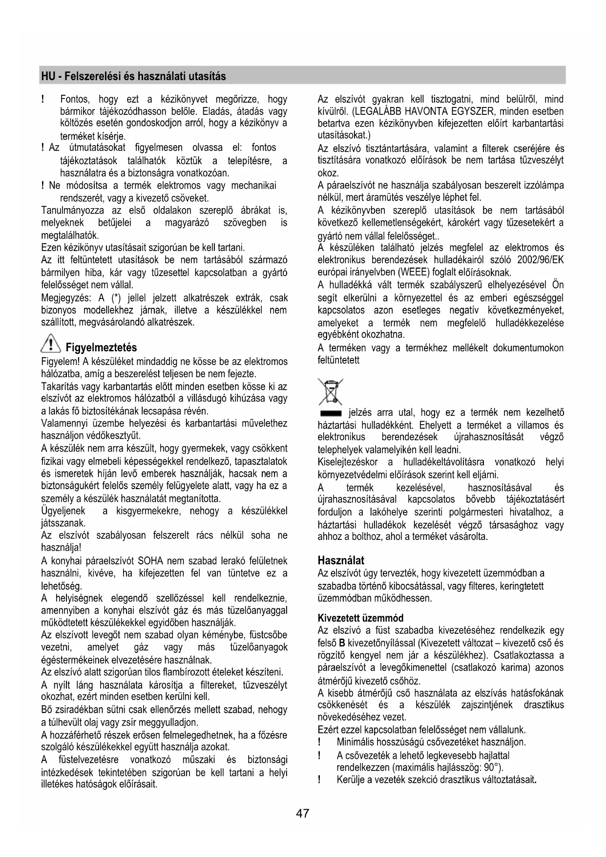 Figyelem! Az elszívó tisztán tartására, valamint a filterek
