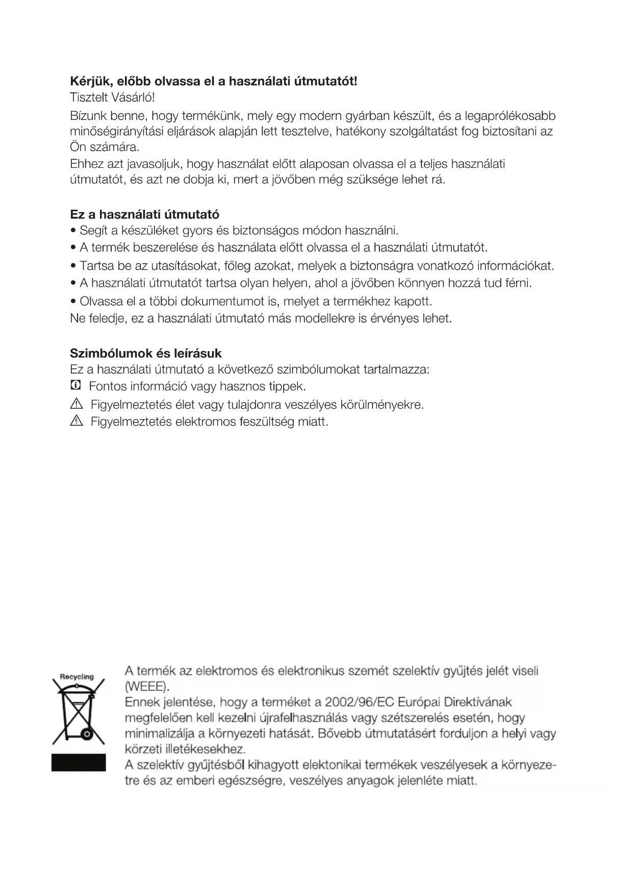 • Tartsa be az utasításokat, főleg azokat, melyek a biztonságra vonatkozó információkat.