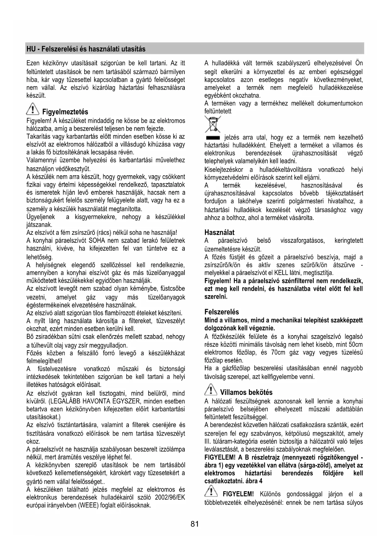 Figyelem! Az elszívó tisztán tartására, valamint a filterek