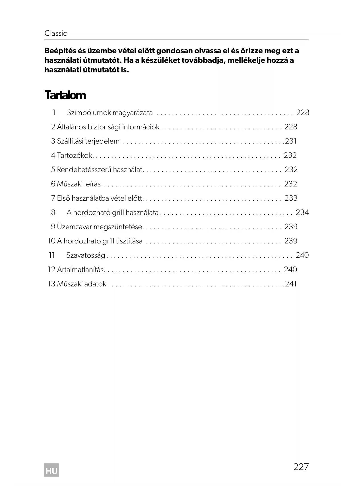 - A hordozható grillt csak akkor fogja meg csupasz kézzel, ha az már lehült a környezeti hőmérsékletre.