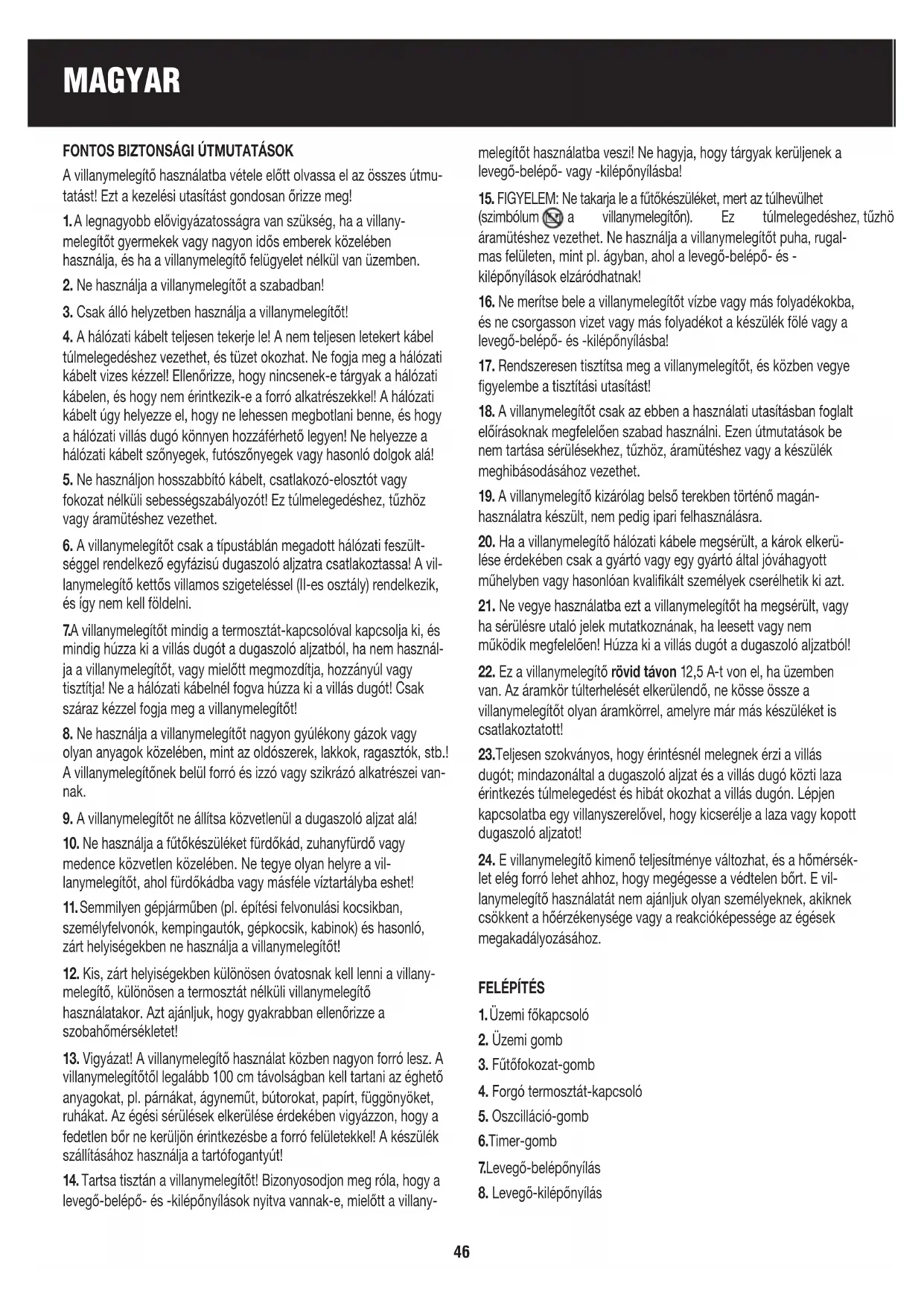 FONTOS BIZTONSÁGI ÚTMUTATÁSOK A villanymelegítő használatba vétele előtt olvassa el az összes útmu-