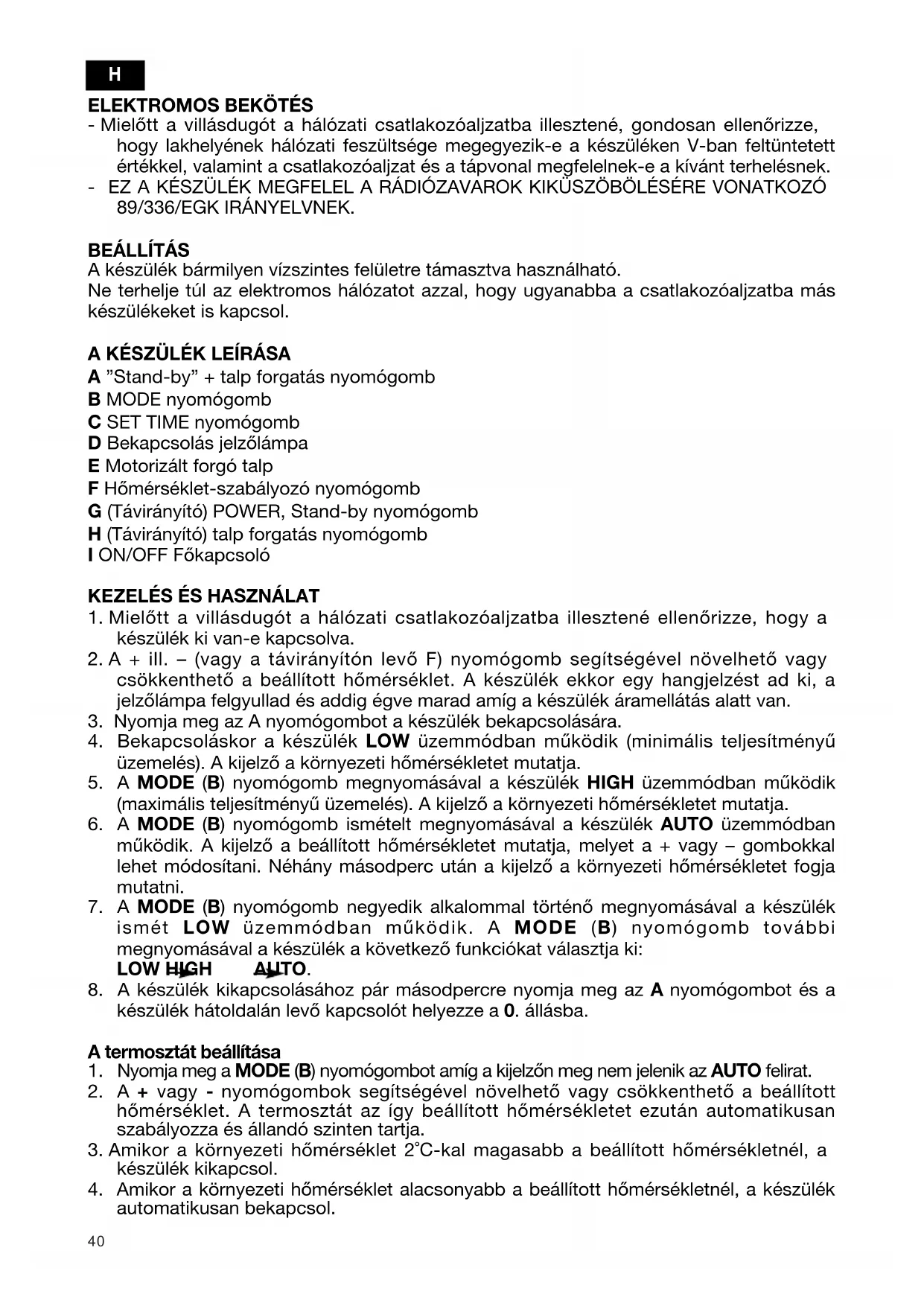 A KÉSZÜLÉK LEÍRÁSA A ”Stand-by” + talp forgatás nyomógomb