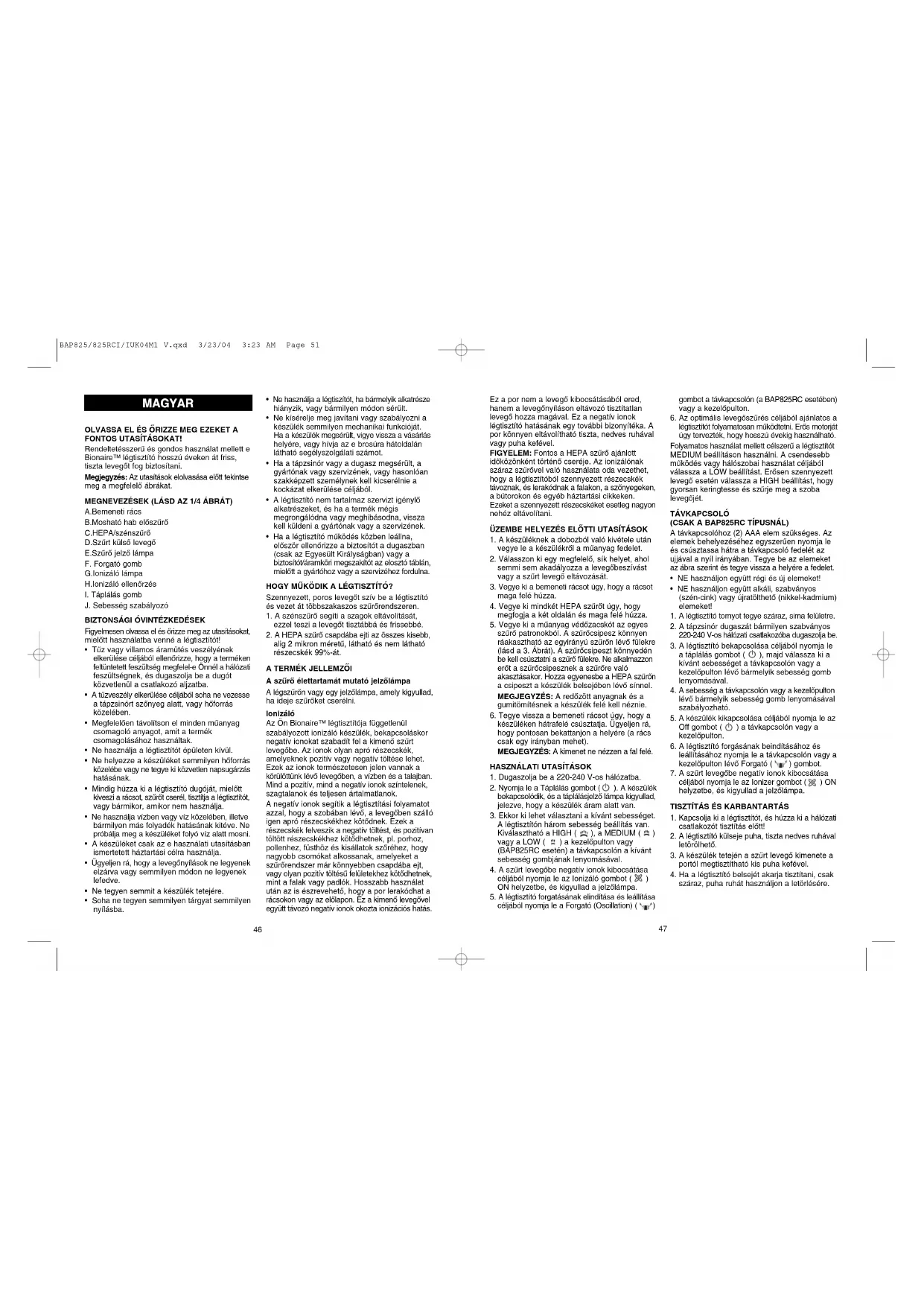 HASZNÁLATI ÚTMUTATÓ BAP825 BIONAIRE